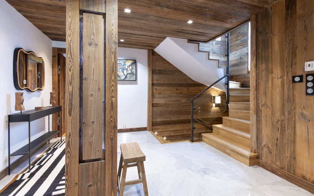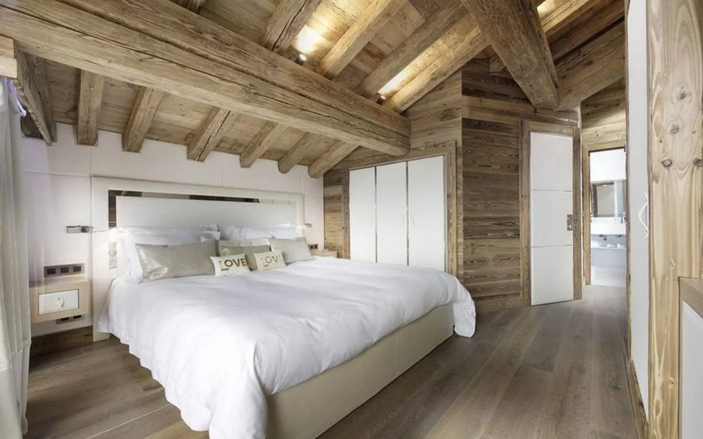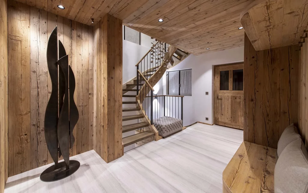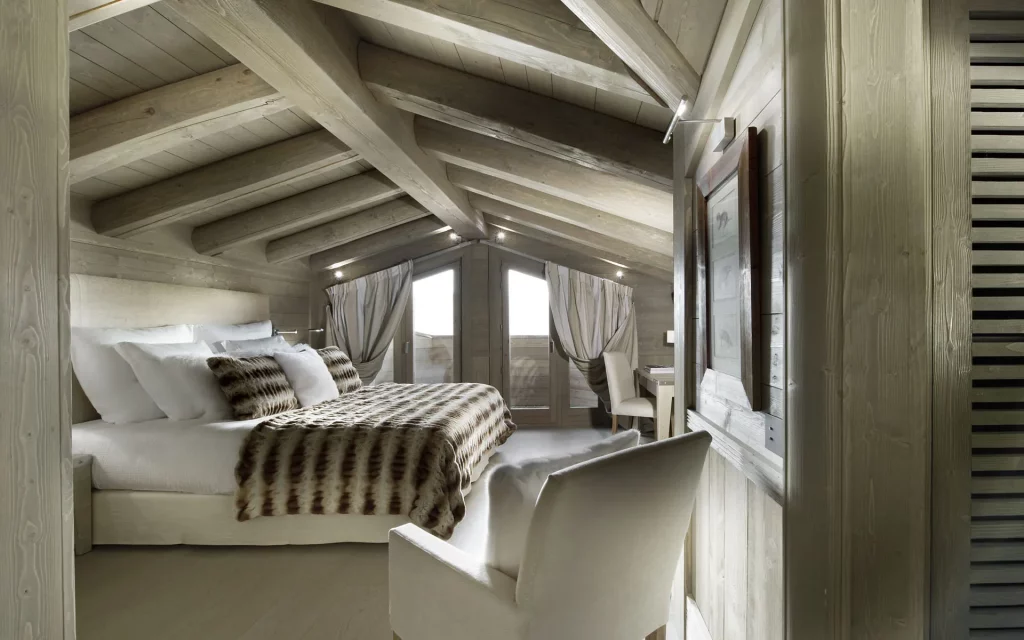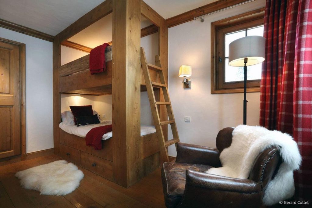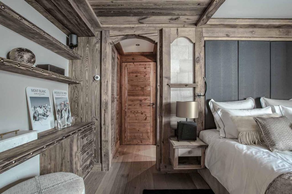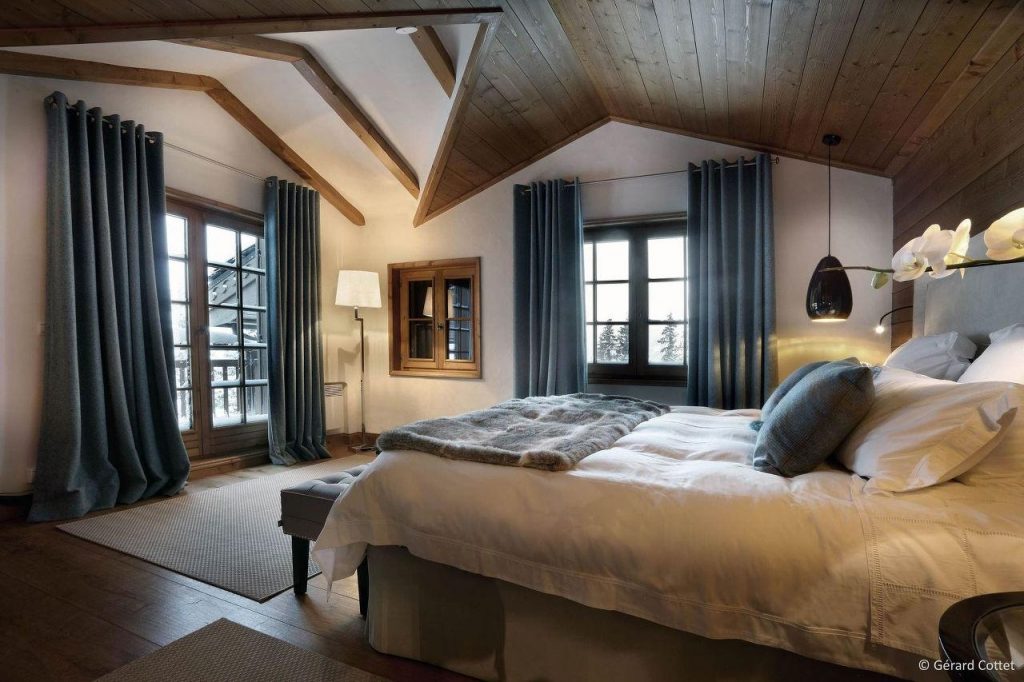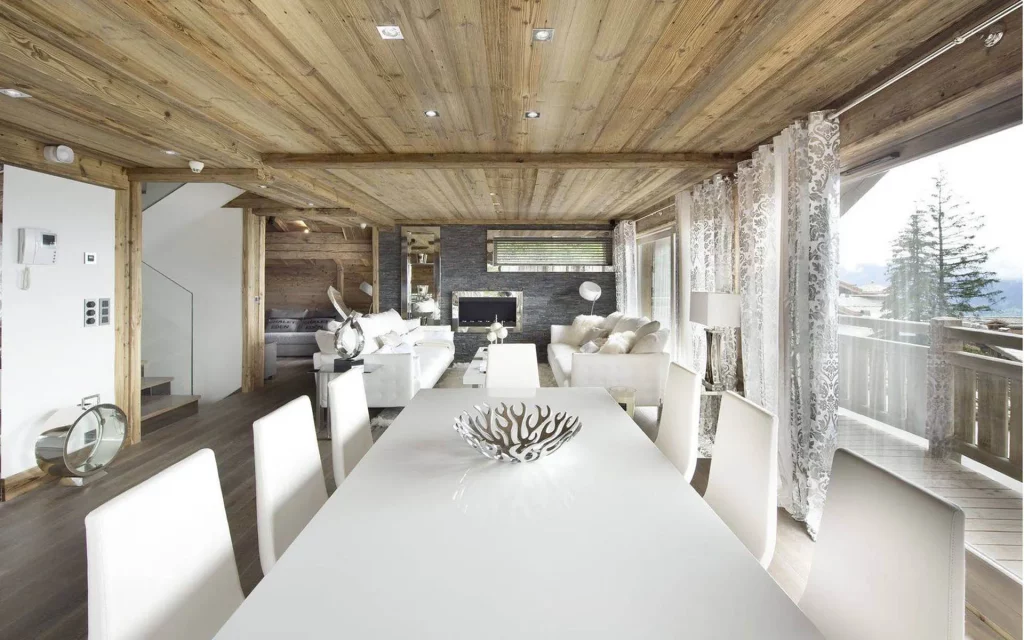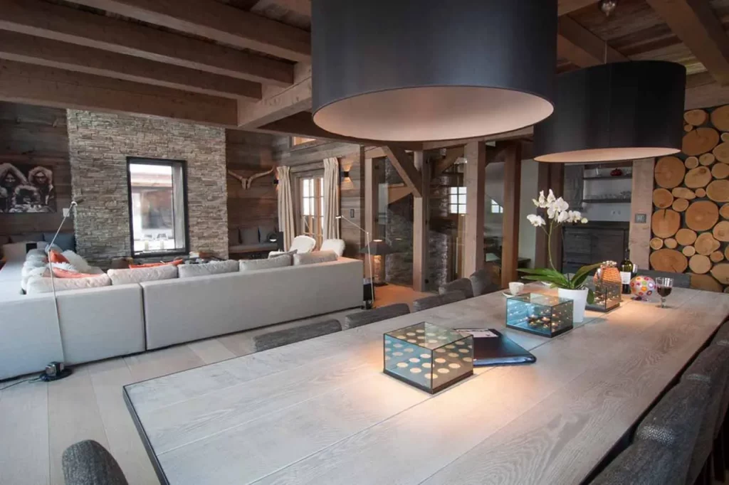 Шале у Межеві за проектом відомого Жерара Равелло створив американський парижанин Еліот Барнс. Камінь П'єра де Вальса та сосна - дві основні складові в обмеженій палітрі. Тут буквально все виготовлено із надякісних матеріалів і виглядає стильно та елегантно.