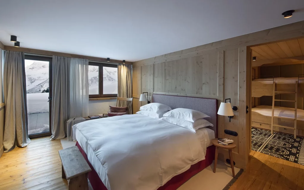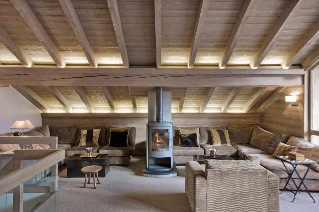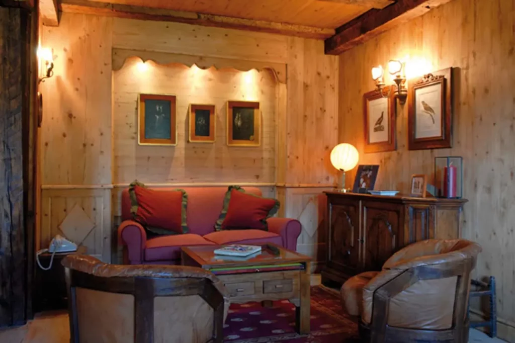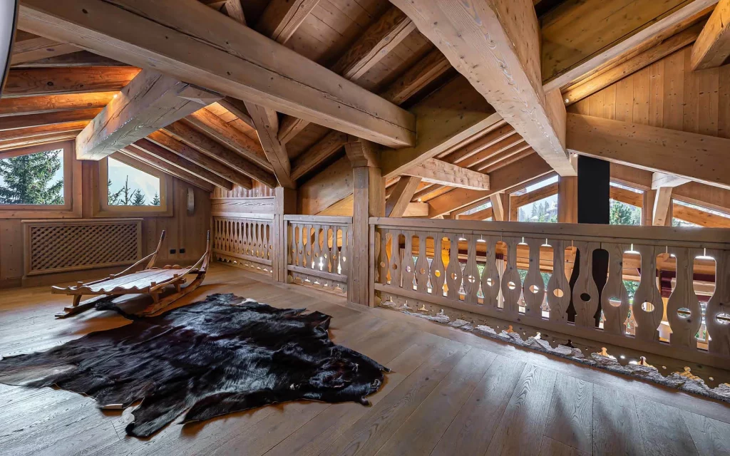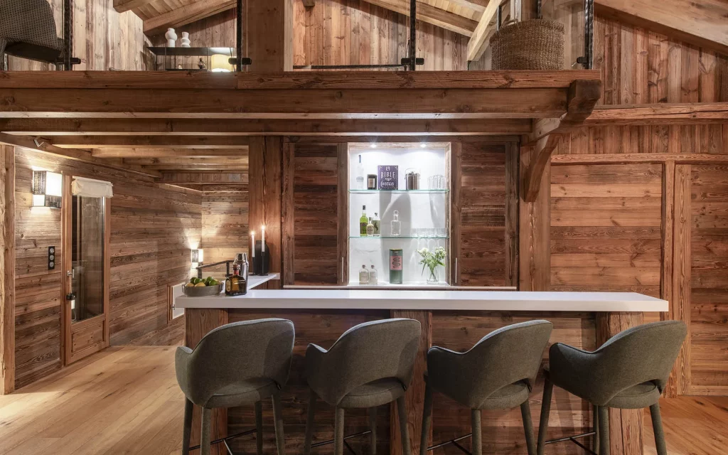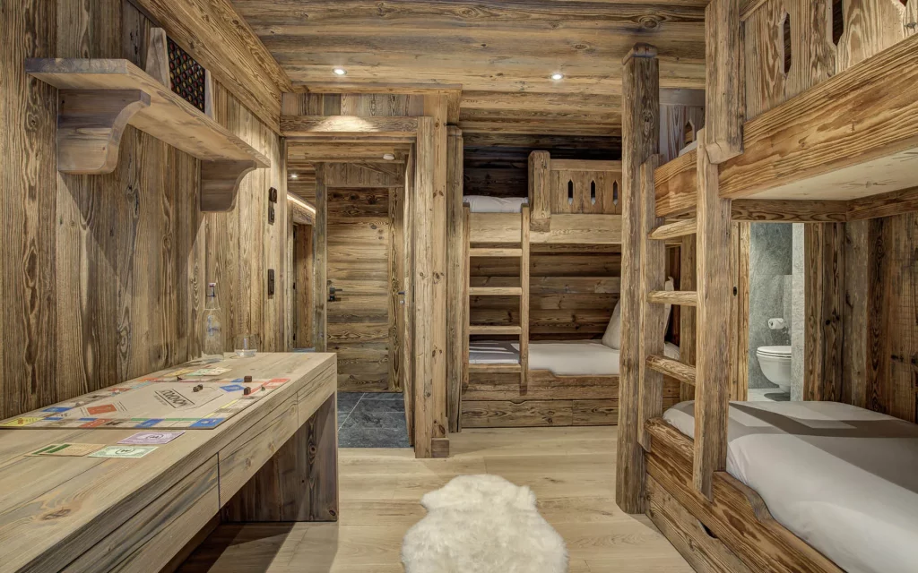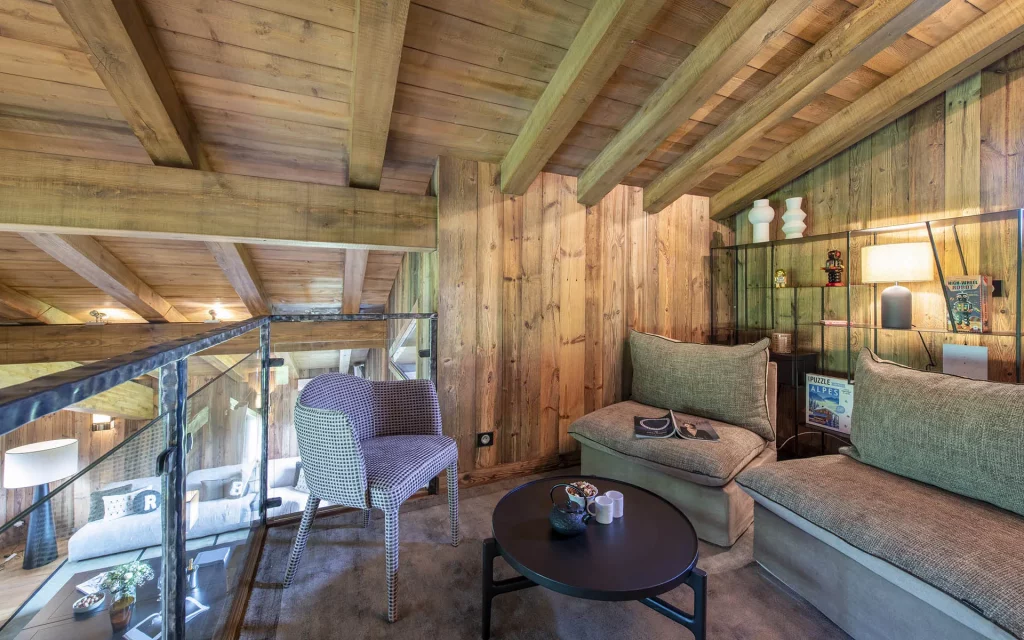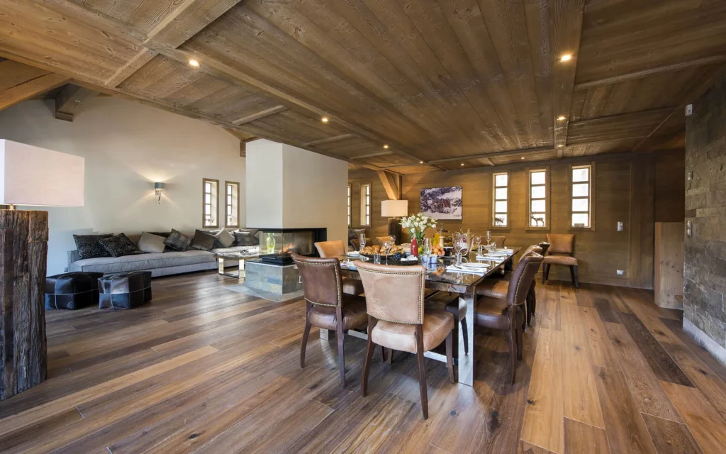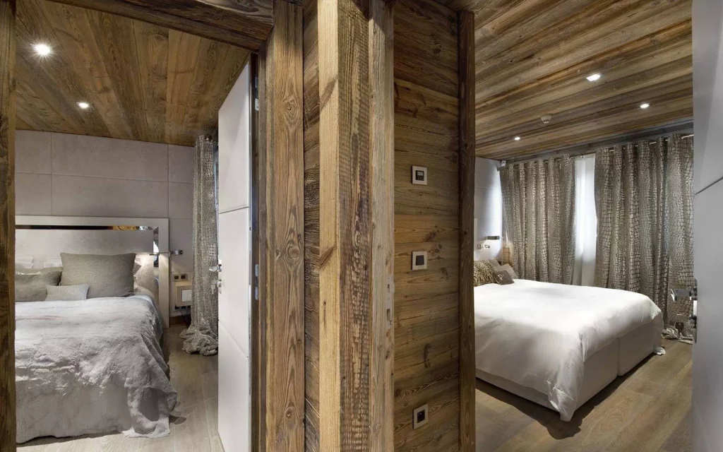Шале у Межеві за проектом відомого Жерара Равелло створив американський парижанин Еліот Барнс. Камінь П'єра де Вальса та сосна - дві основні складові в обмеженій палітрі. Тут буквально все виготовлено із надякісних матеріалів і виглядає стильно та елегантно.