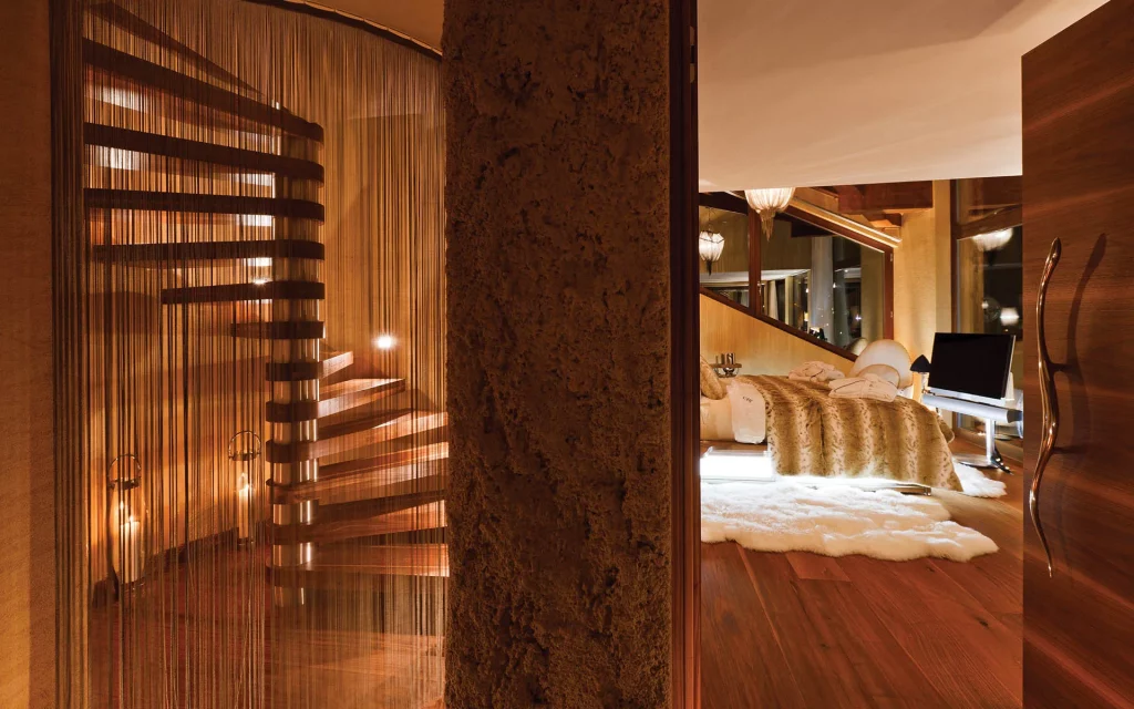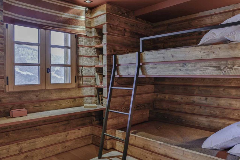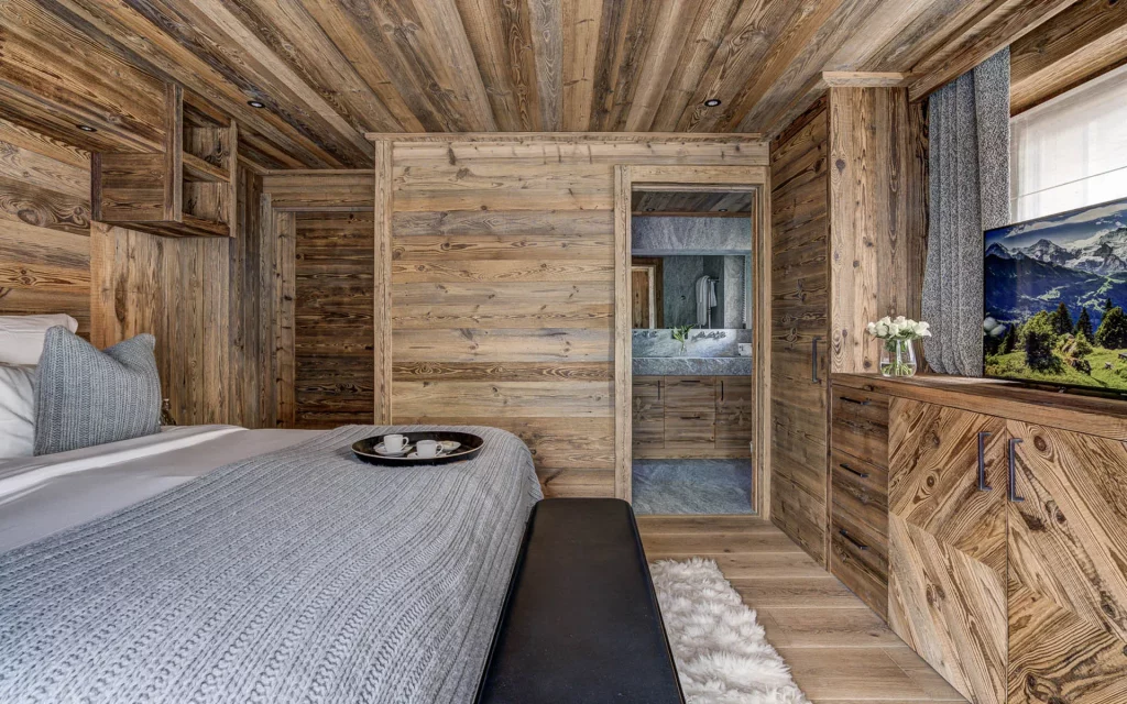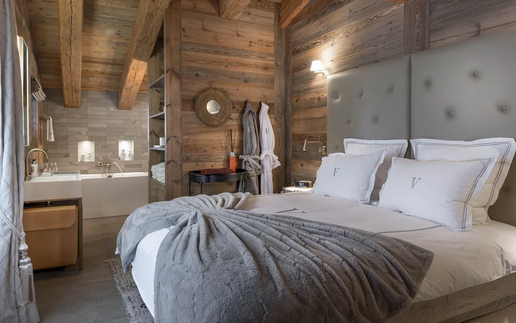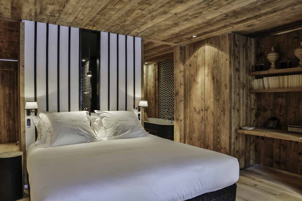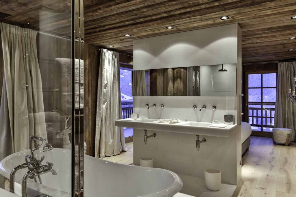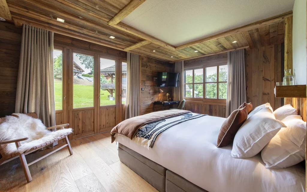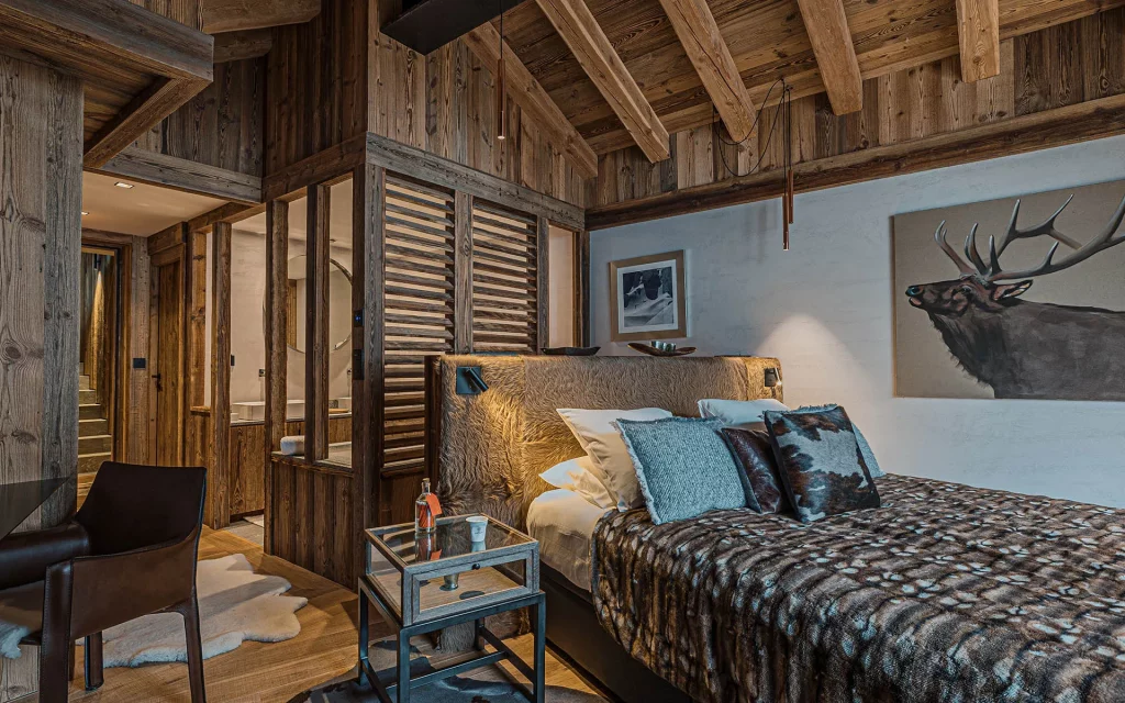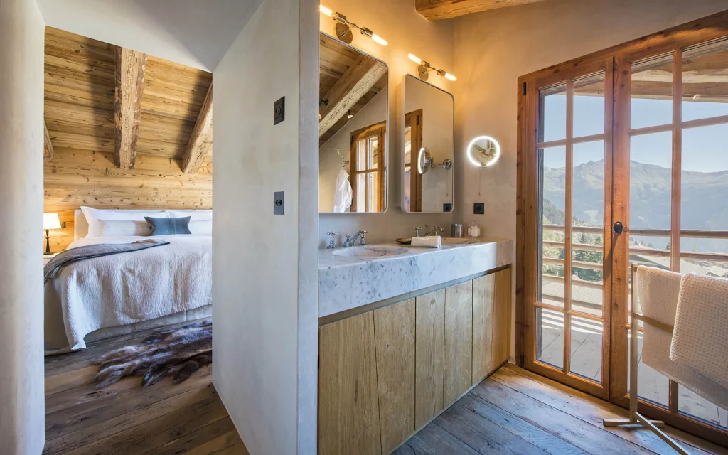 Шале у Межеві за проектом відомого Жерара Равелло створив американський парижанин Еліот Барнс. Камінь П'єра де Вальса та сосна - дві основні складові в обмеженій палітрі. Тут буквально все виготовлено із надякісних матеріалів і виглядає стильно та елегантно.