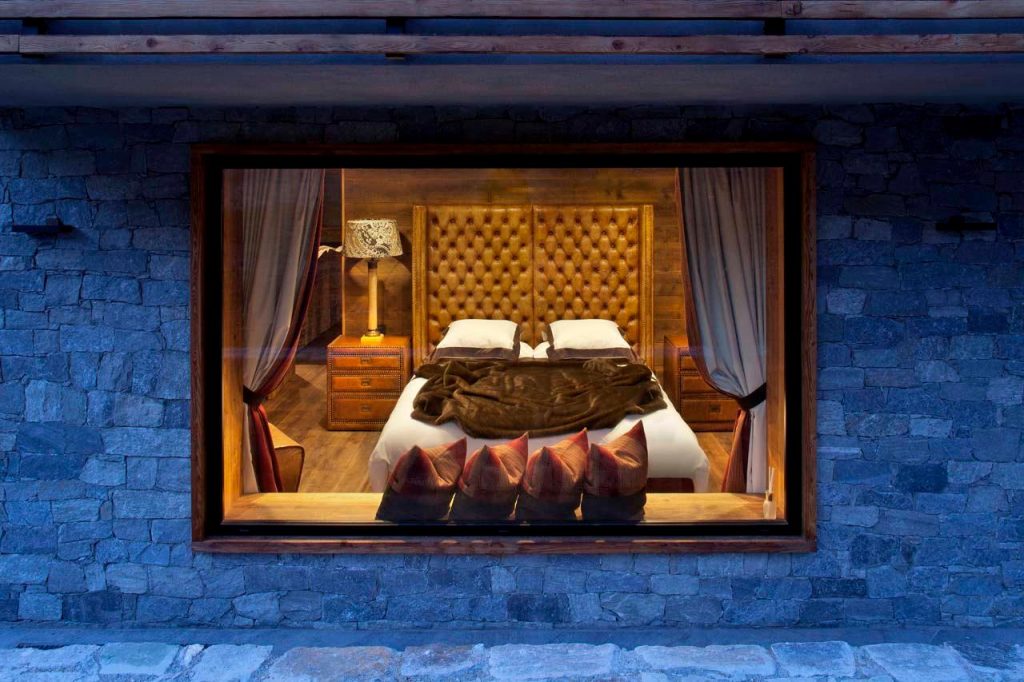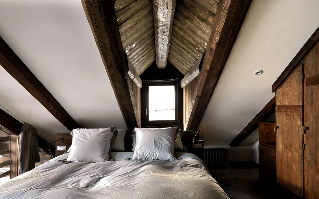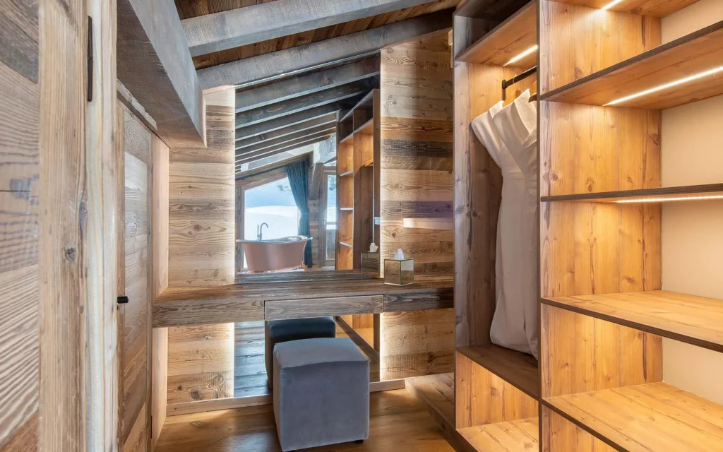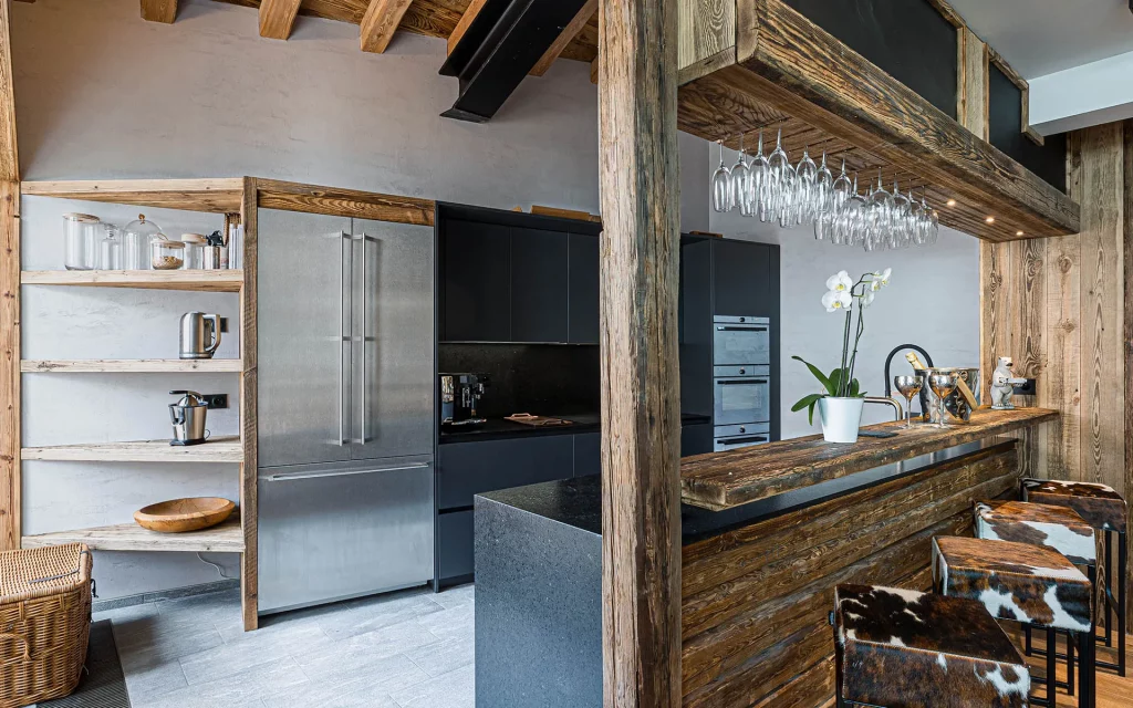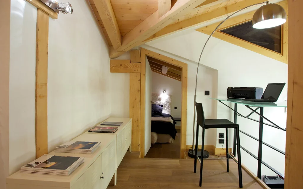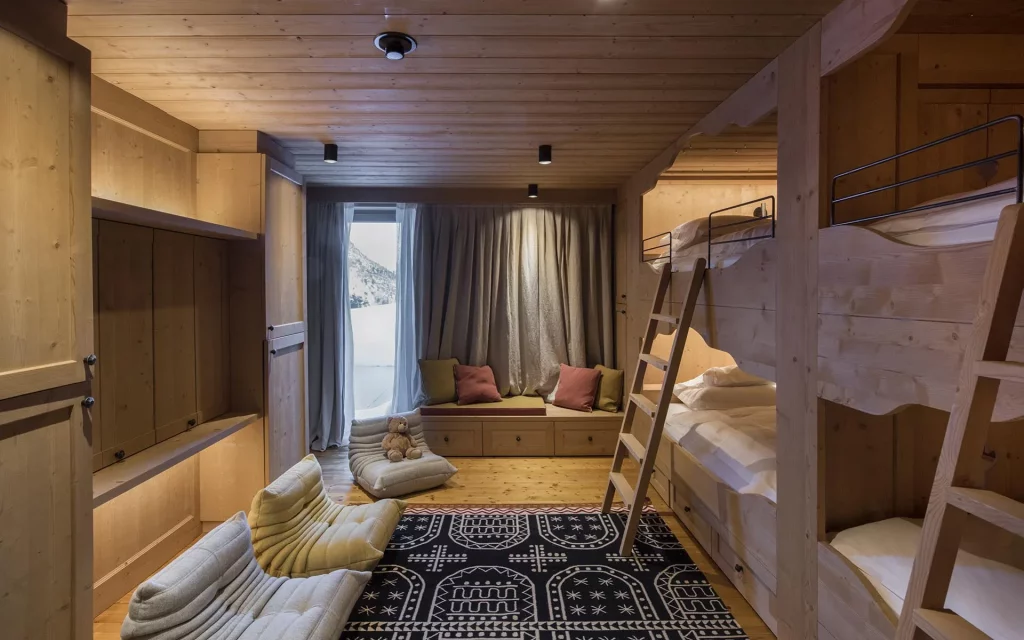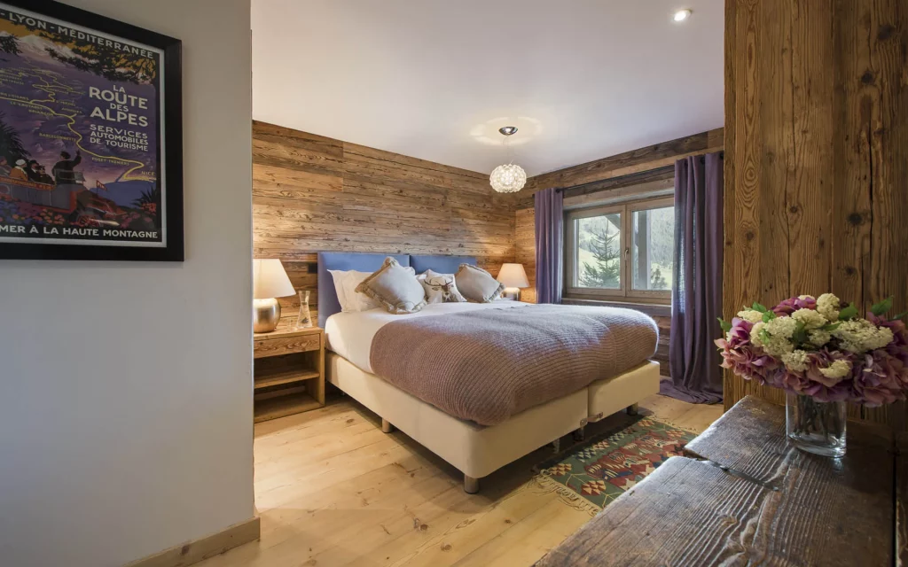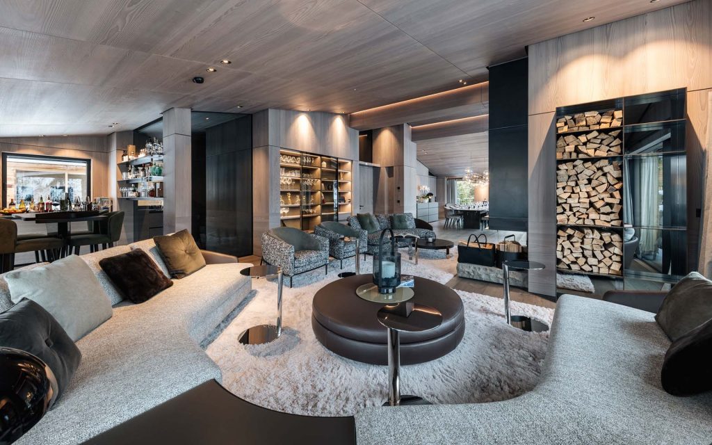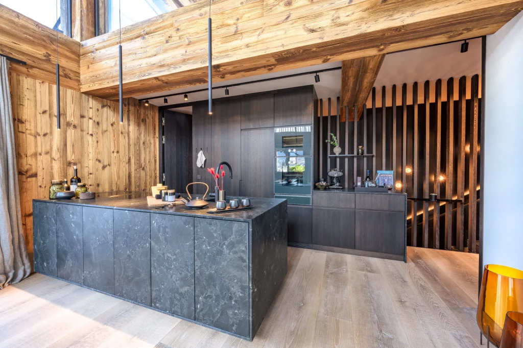 Шале у Межеві за проектом відомого Жерара Равелло створив американський парижанин Еліот Барнс. Камінь П'єра де Вальса та сосна - дві основні складові в обмеженій палітрі. Тут буквально все виготовлено із надякісних матеріалів і виглядає стильно та елегантно.