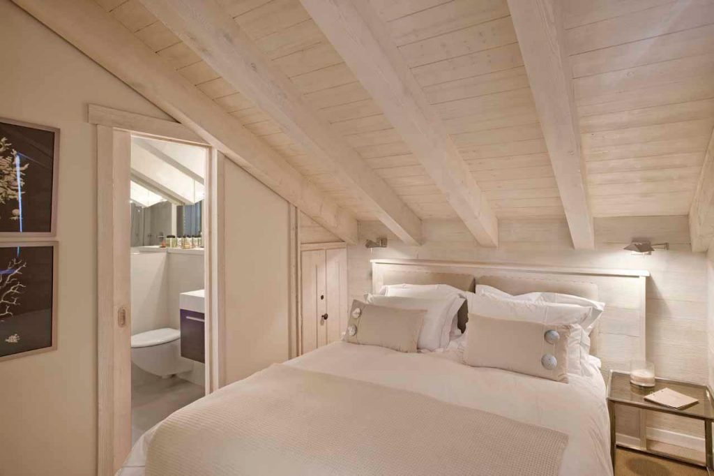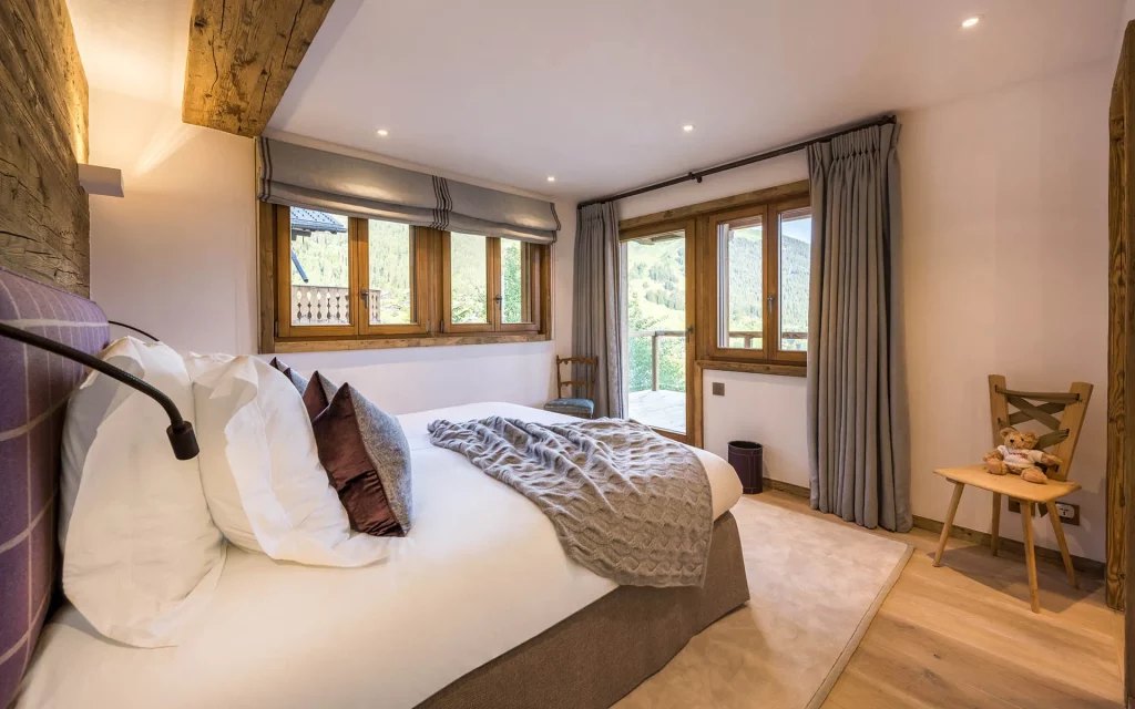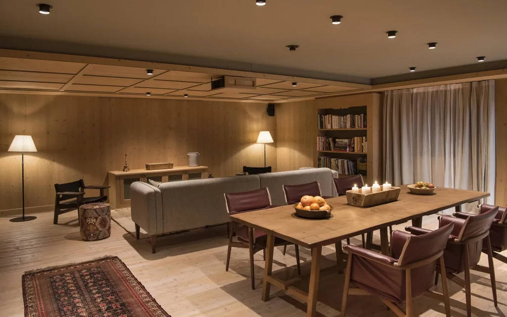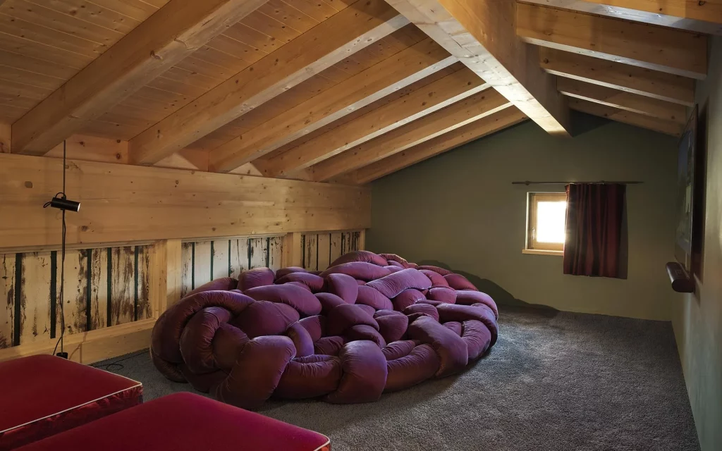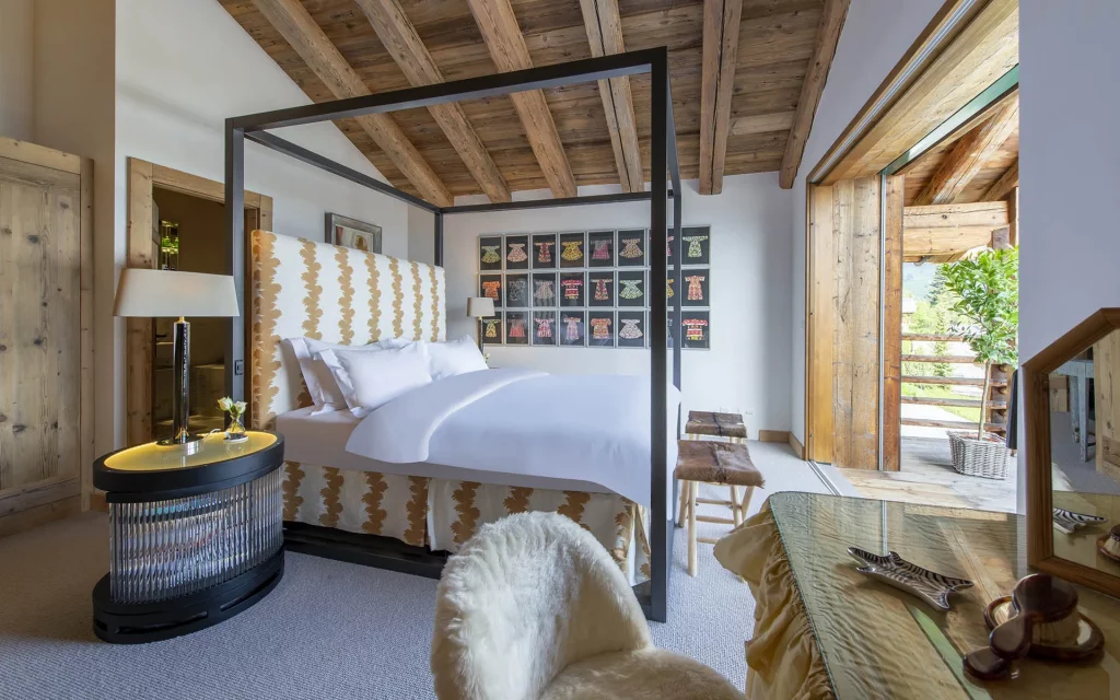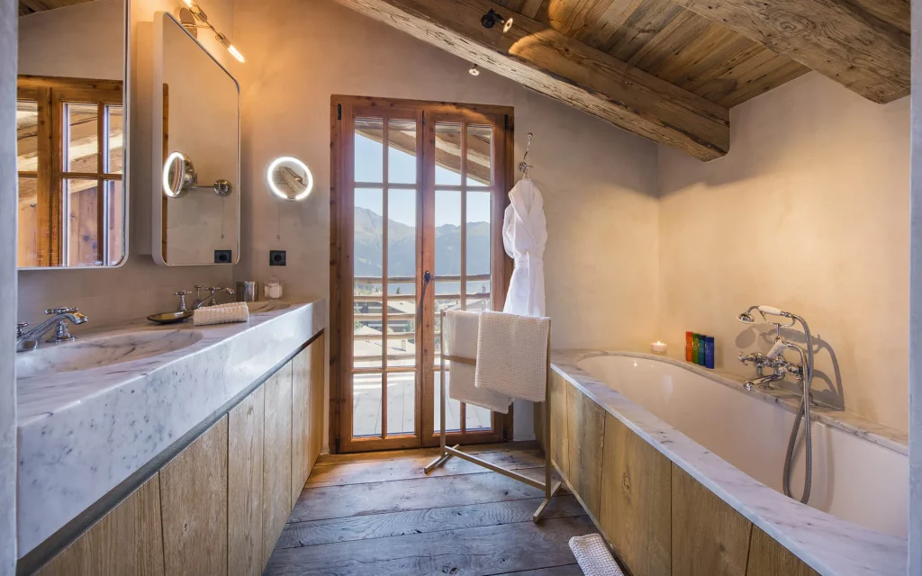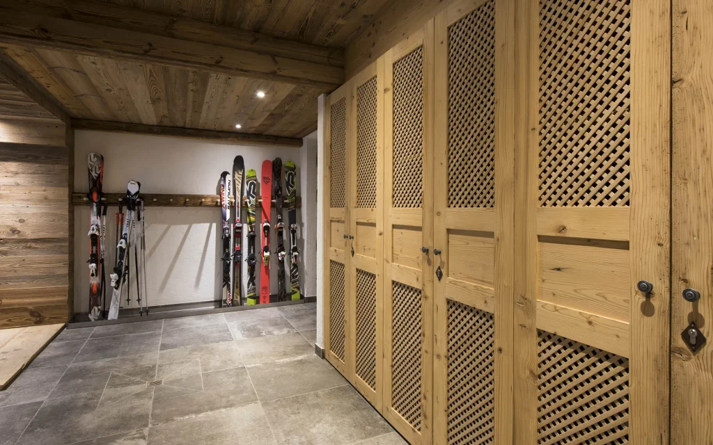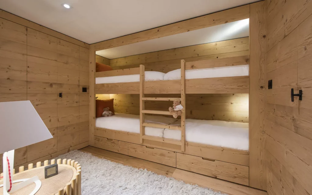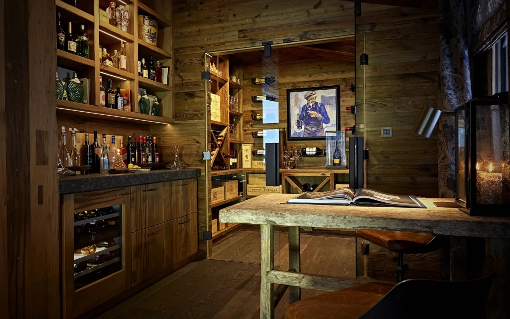 Шале у Межеві за проектом відомого Жерара Равелло створив американський парижанин Еліот Барнс. Камінь П'єра де Вальса та сосна - дві основні складові в обмеженій палітрі. Тут буквально все виготовлено із надякісних матеріалів і виглядає стильно та елегантно.