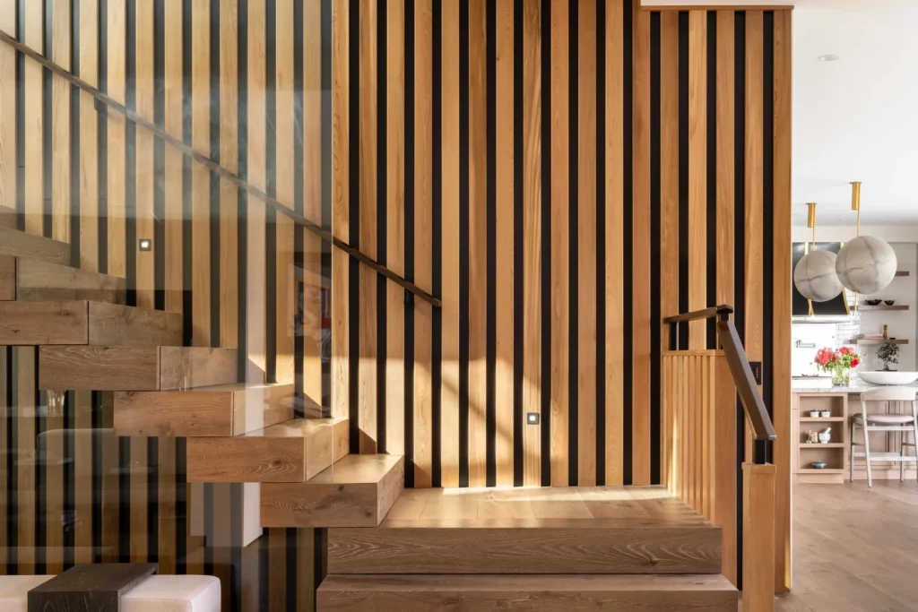 Перший поверх. Площа 90 м², включає окрему обідню зону, вітальню та функціональну кухню, оснащену преміальною фурнітурою та технікою. Сучасний камін Piazzetta та дизайнерські меблі створюють атмосферу тепла та затишку. Також на поверсі є гостьовий санвузол та житлова кімната, яку можна використовувати як спальню або робочий кабінет.