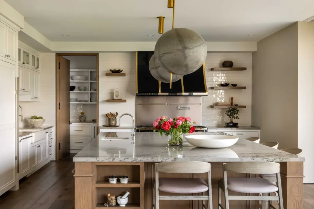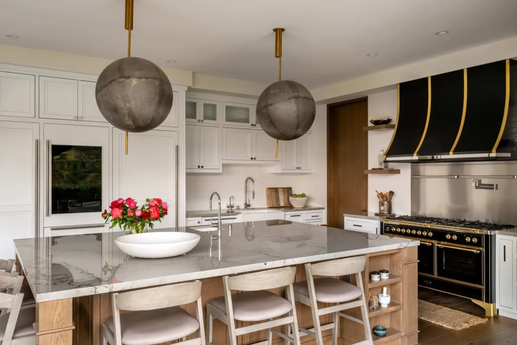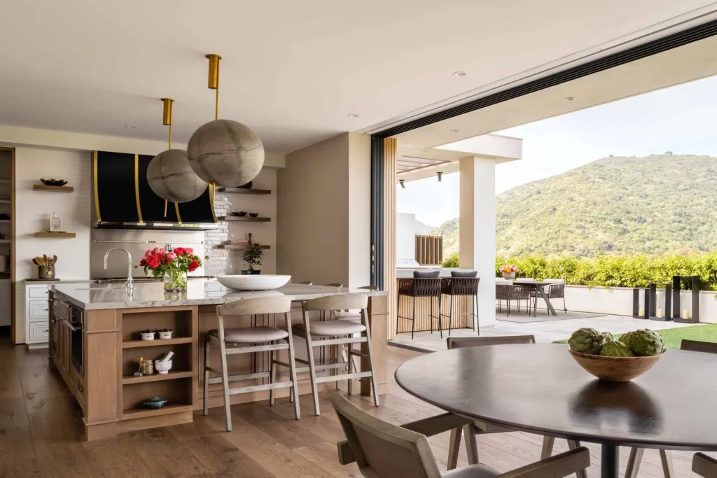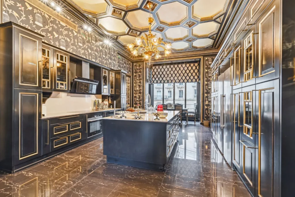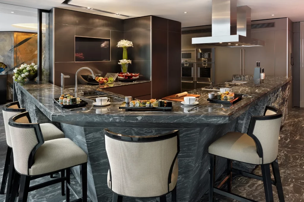 Бездоганно спроектована кухня в японському стилі оснащена стільницями та підлогою із чорного лісового граніту, побутовою технікою Gaggenau та великою мармуровою стільницею. Японська тема триває у сусідньому залі для сніданків із ширмами седзи у пазах, вирізаних у камені замість віконних жалюзі.