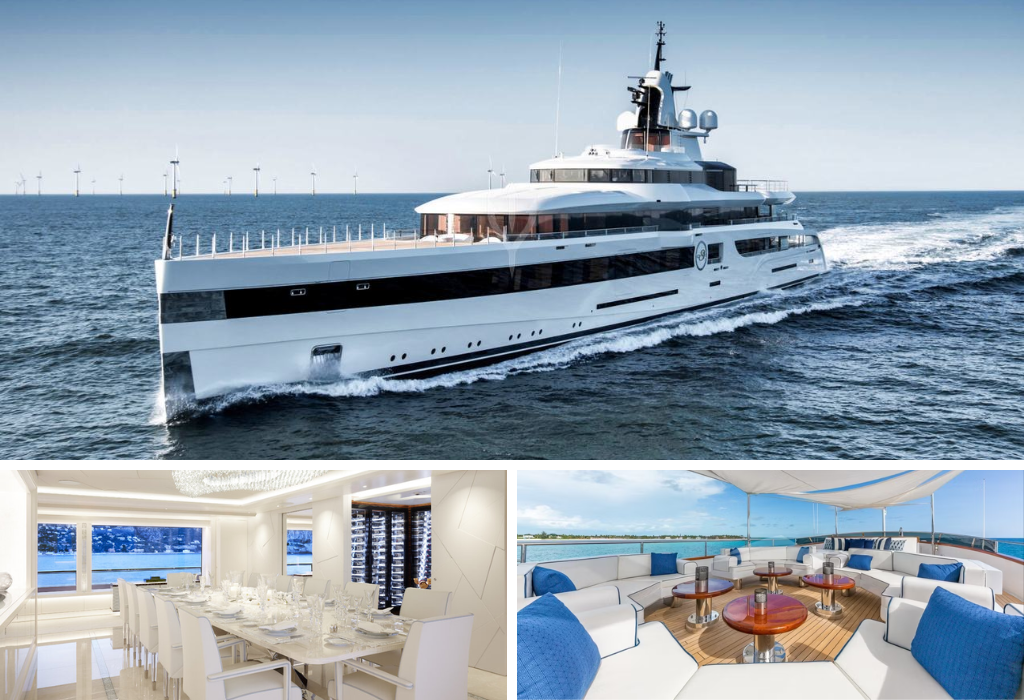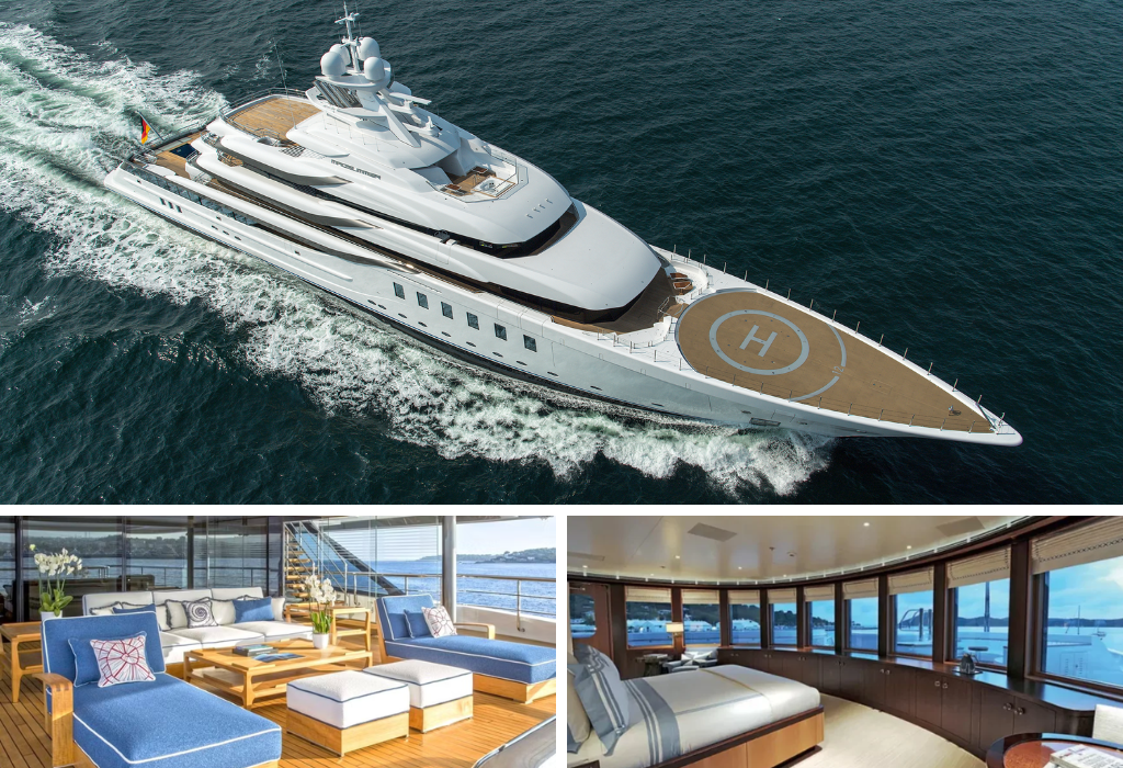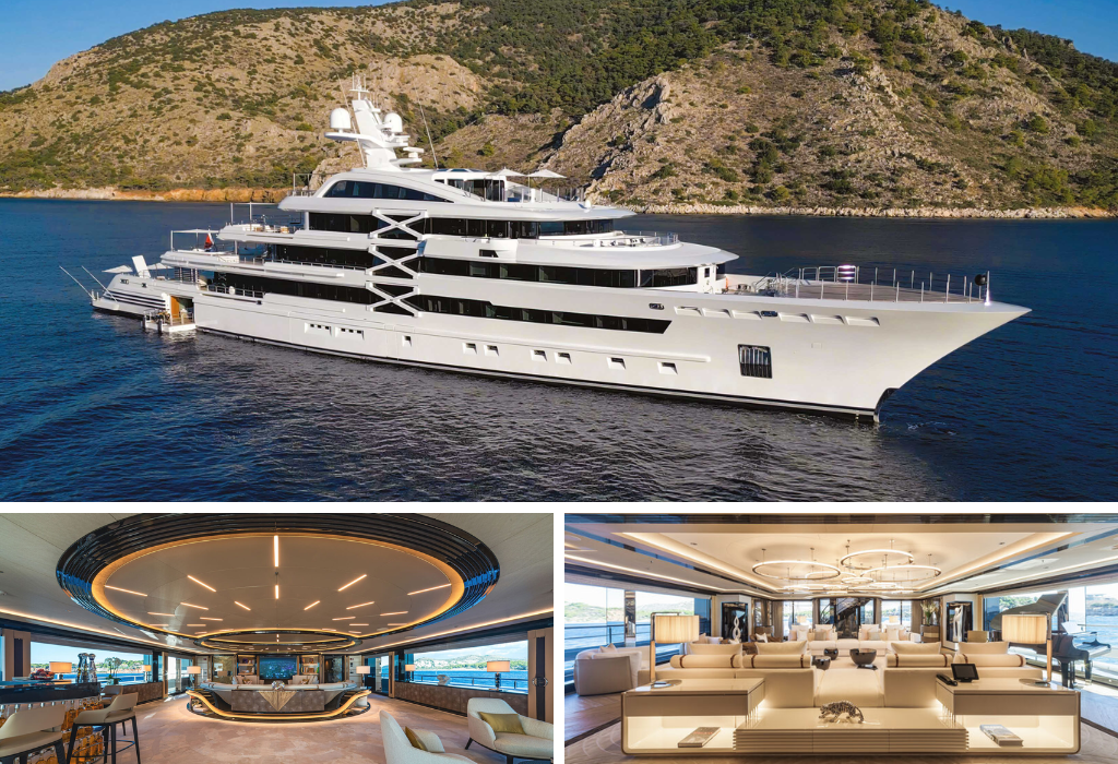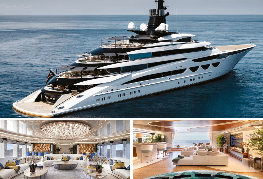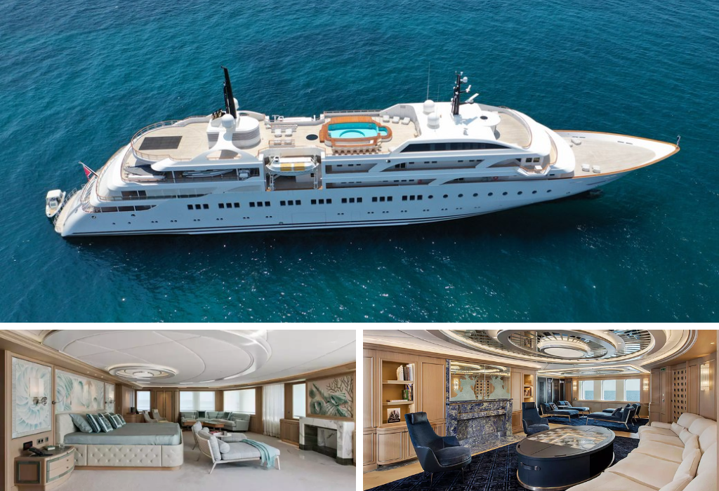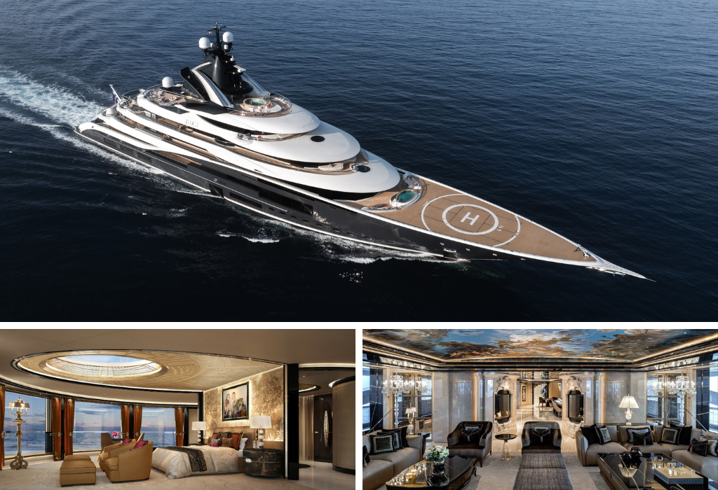 122-meter super yacht with interiors in Versailles style – mosaic floors, Murano chandeliers, stone fireplaces. On board there is a nightclub with a dance floor, a pool with a transparent wall, three Jacuzzis, a hammam, a cryo-chamber and an underwater lounge area. The yacht is equipped with two certified helipads and is ideal for colorful events in a closed circle.