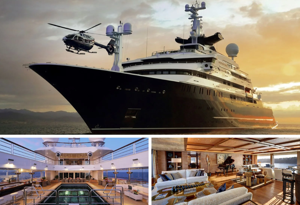 The former expedition yacht of Paul Allen (co-founder of Microsoft) is available for private charter. The 126-meter Octopus is equipped with two helipads, a hangar, a submarine, a science lab, a diving center and a concert hall. Also on board are a movie theater, heated swimming pool, Jacuzzi and an underwater viewing room.