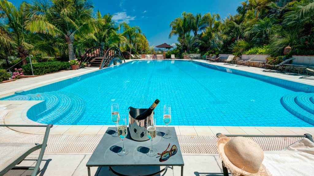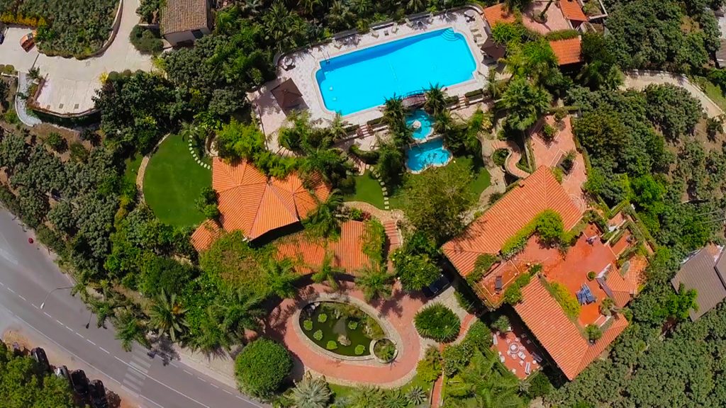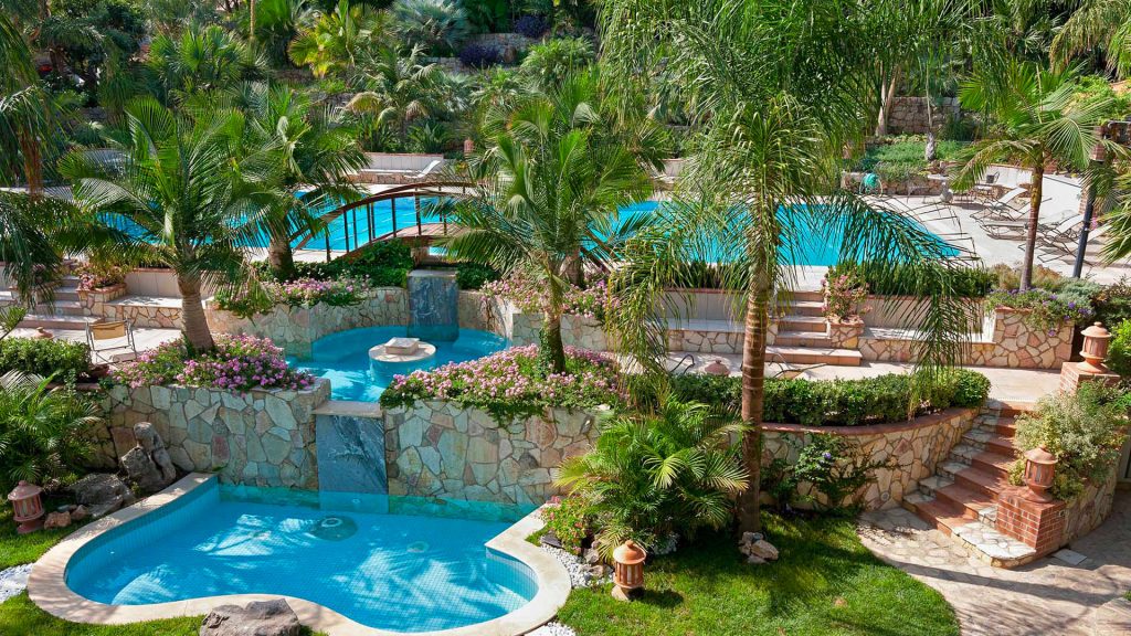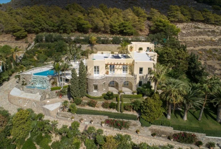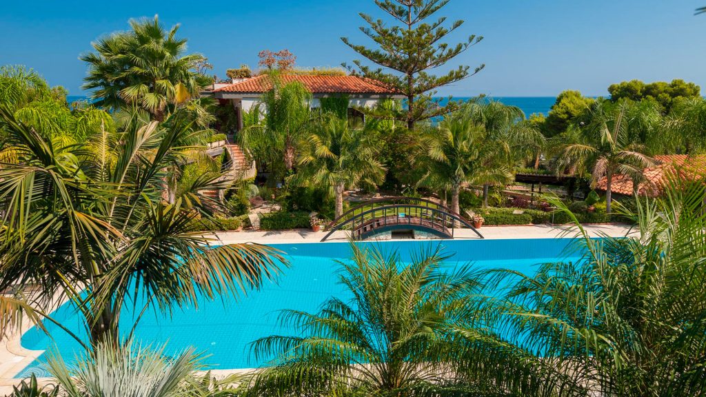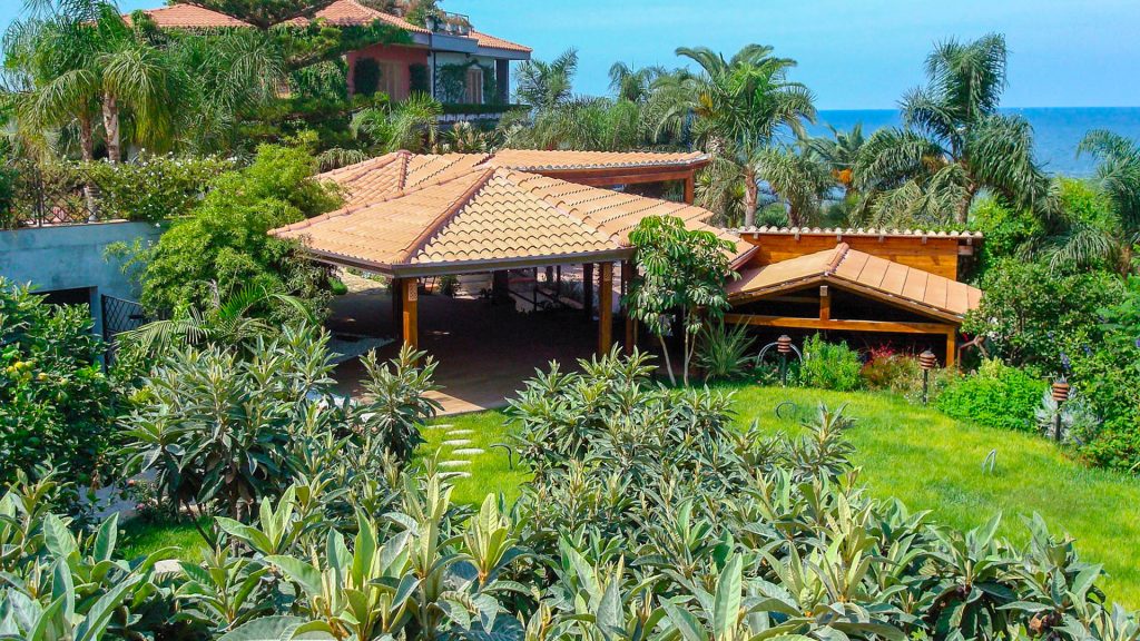 Маєток, обладнаний трьома басейнами, з'єднаними двома водоспадами та розташований у центрі масиву екзотичних пальм, розташований за 50 метрів від моря на узбережжі між Палермо та Чефалу.