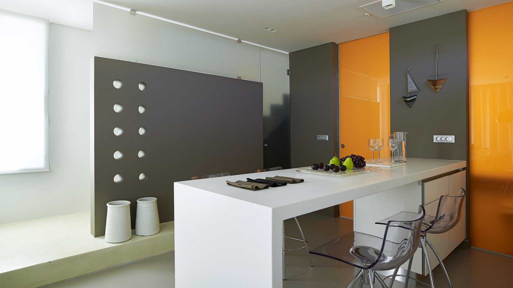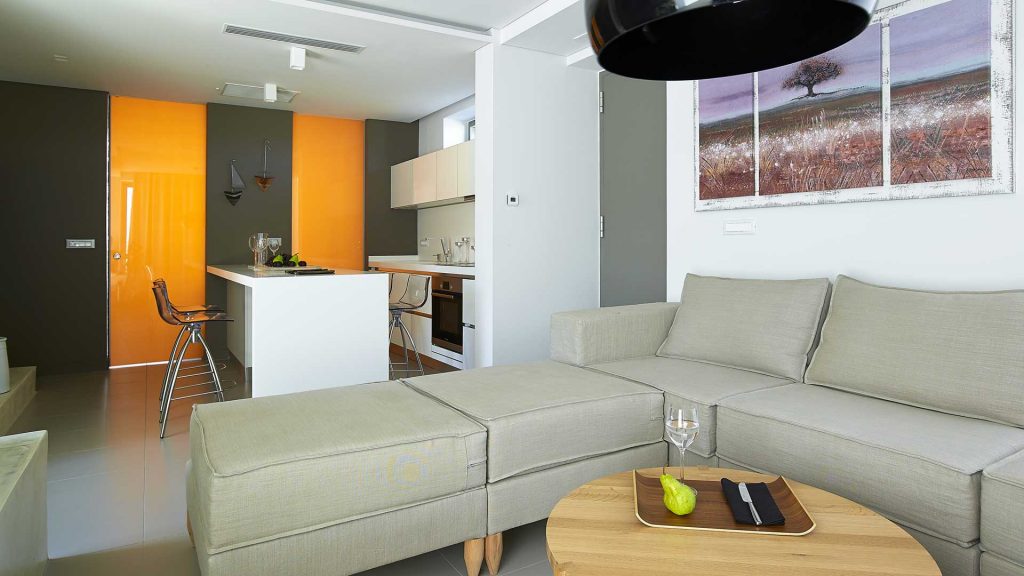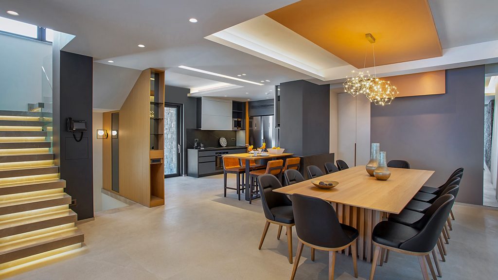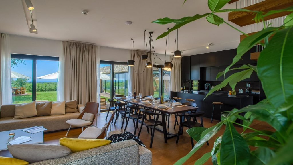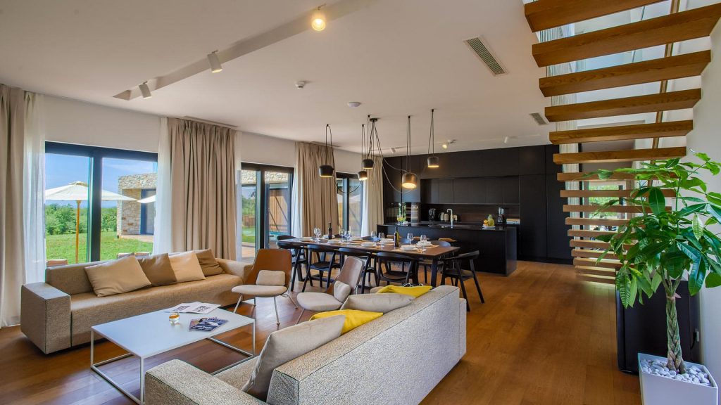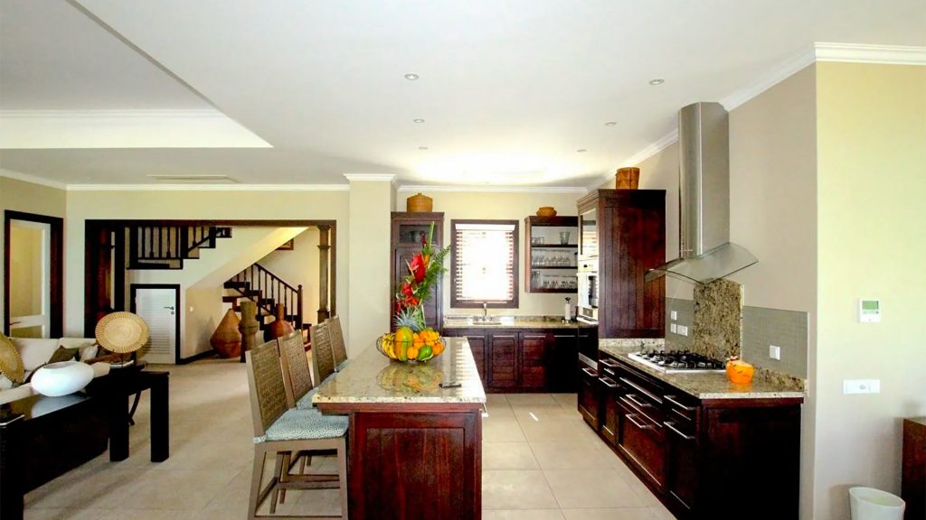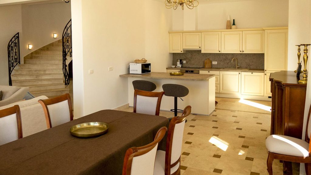 Усередині вілли вдало поєднуються архітектура та зручності. Повністю обладнана кухня зі стильними та практичними робочими поверхнями Corian. Ви потрапляєте до спальні з двоспальним або двома односпальними ліжками на першому поверсі через кухню, але вона відокремлена стильною скляною перегородкою.