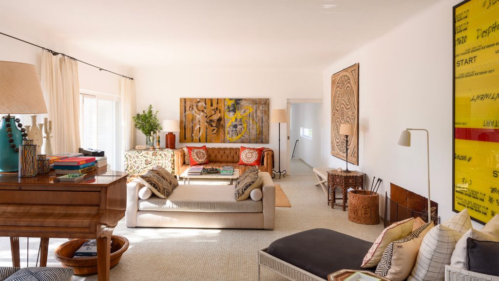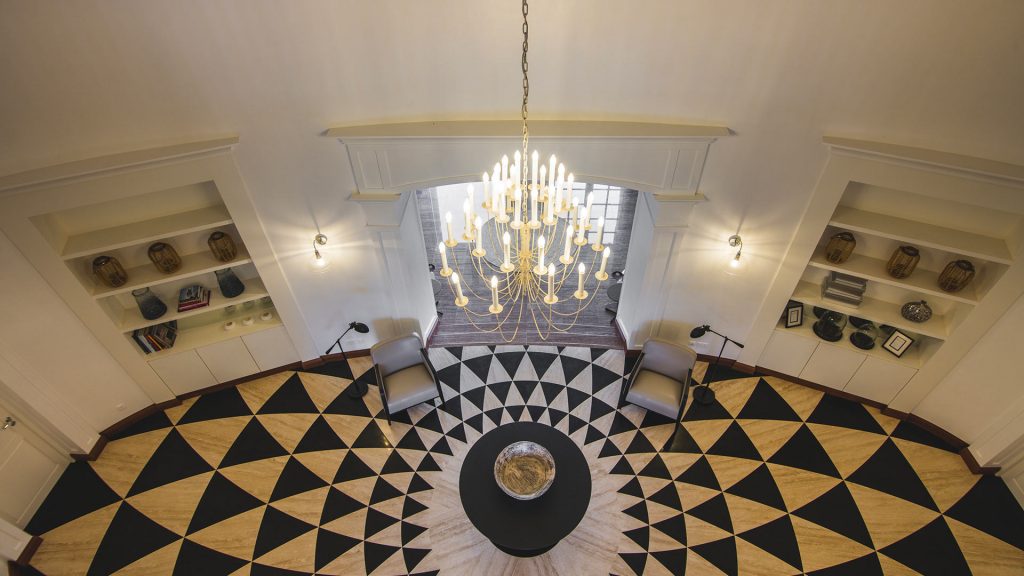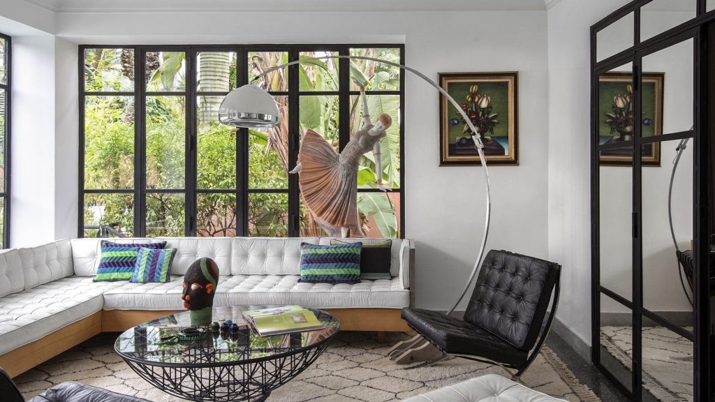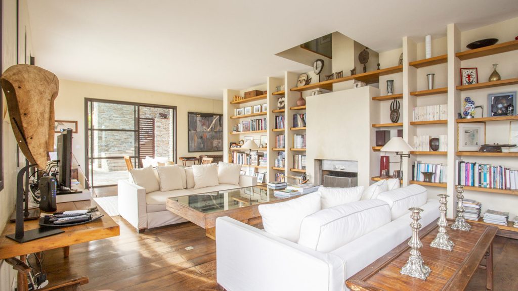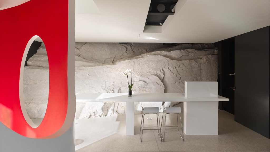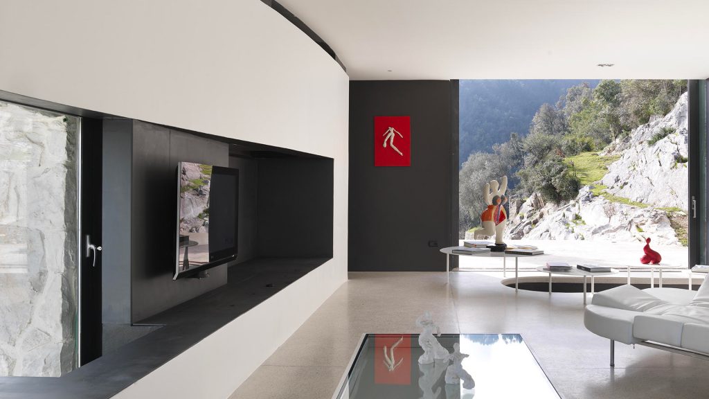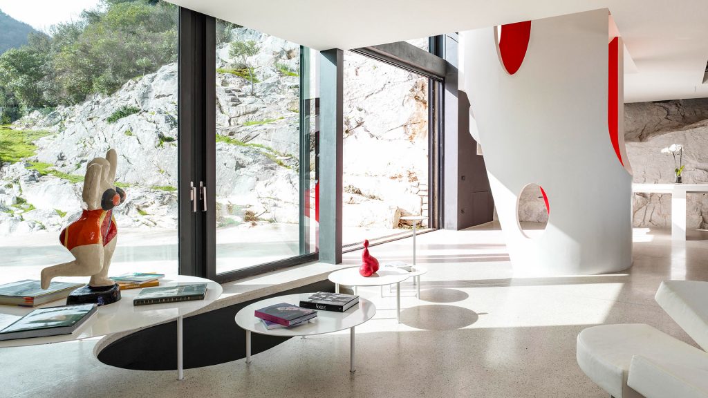 Інтер'єр організований навколо ефектних сходів, представлених у вигляді сліпуче червоної вечірньої сукні. Камінь із білого мармуру присутній у будинку та з'являється на трьох поверхах. Архітектура, меблі, світильники, скульптури, майже все було задумано, спроектовано та виготовлено на замовлення для вілли їхніми власниками.