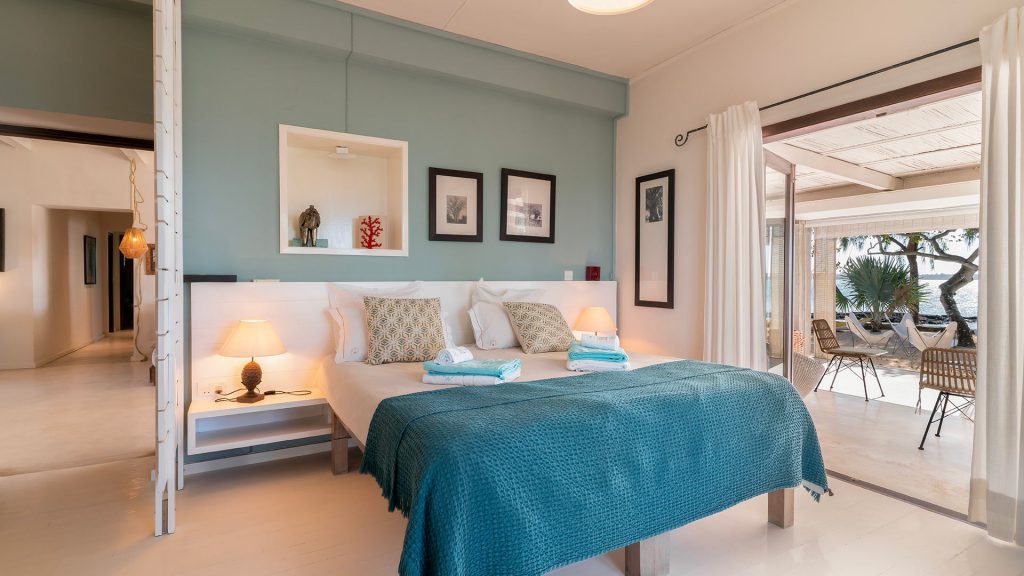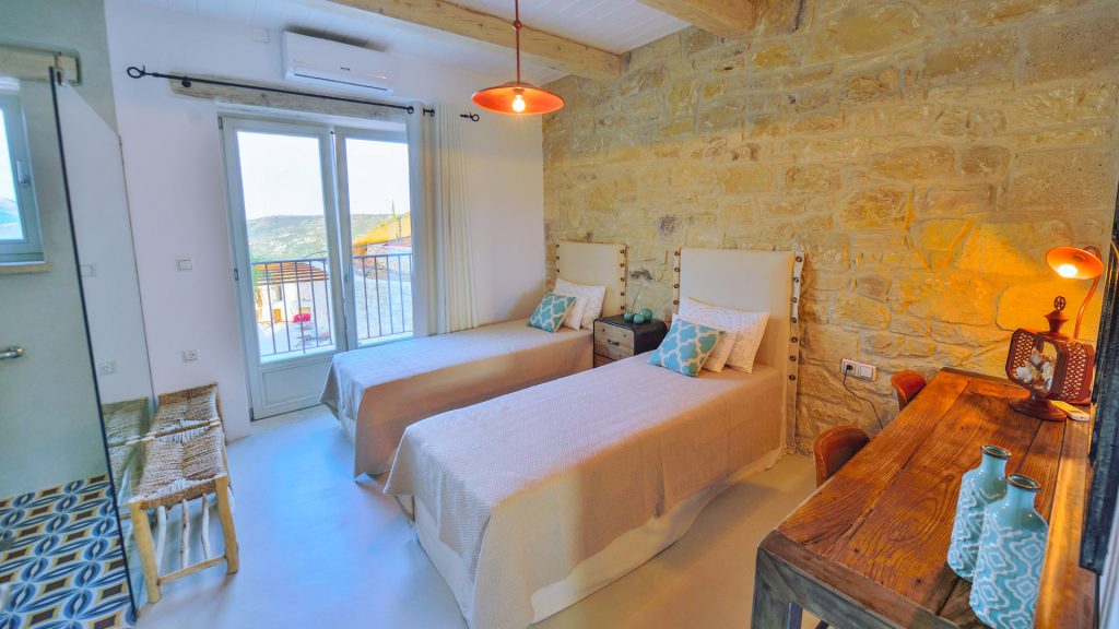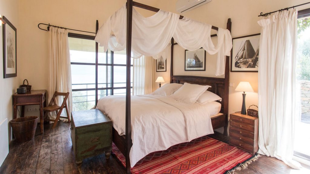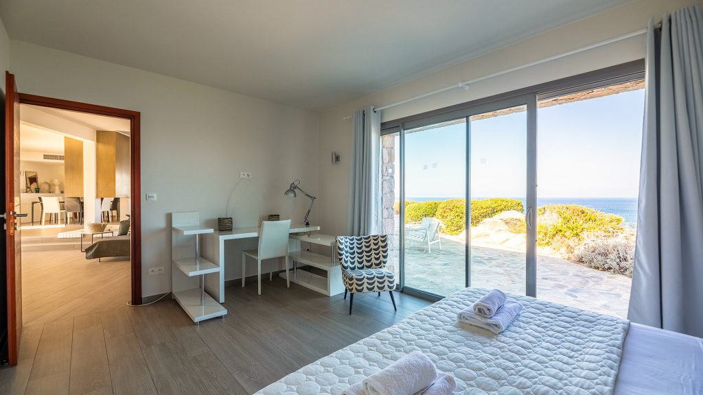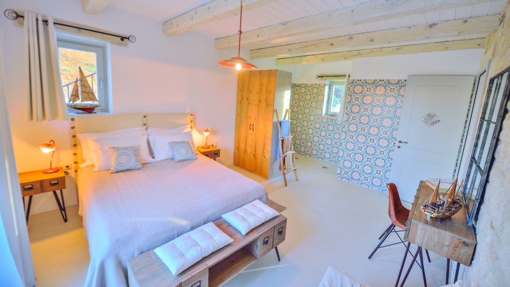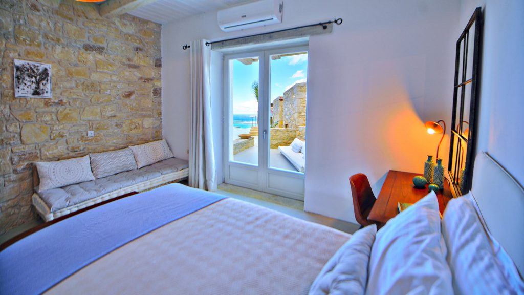 Характерні сходи Cimentogonia ведуть на другий поверх, де головна спальня має власний балкон та пропонує вид на блакитні води Егейського моря. У цій спальні є власна ванна кімната з ванною.