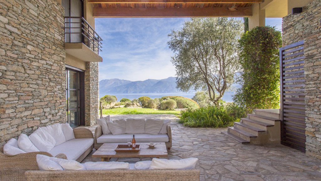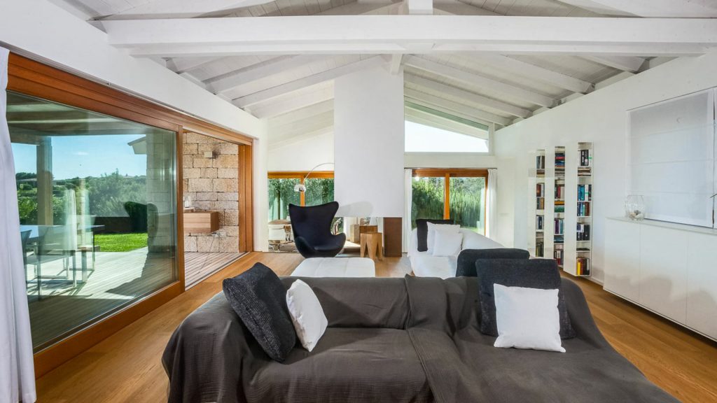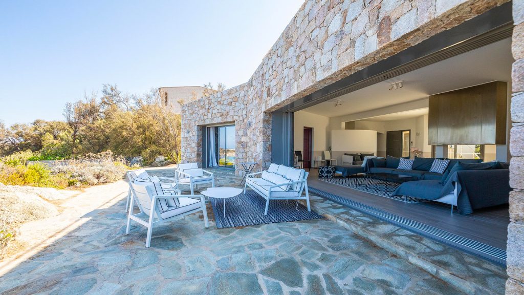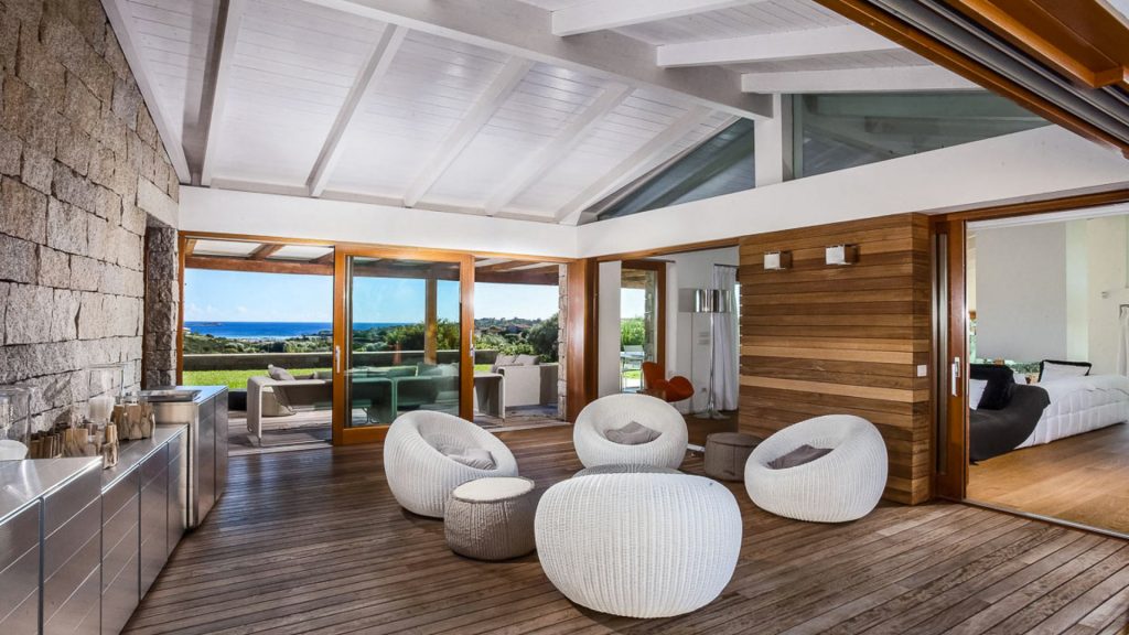 На відміну від більшості об'єктів Коста Смеральда, це сучасна вілла дуже високої якості, створена відомими італійськими архітекторами, які черпали натхнення у традиційному кам'яному сардинському будинку «stazzo gallurese». З цього вони створили розкішну резиденцію, яка також вражає своєю легкістю та відкритістю. Атмосфера розслаблена і ніжна, декор переважно в бежево-білих тонах, білі склепінні стелі з поперечними балками та різноманітні покриття для підлоги з темного дерева (паркет, мостини) доповнюють зроблені на замовлення сучасні меблі в поєднанні дерева, тканини і білої лози. Засклені розсувні стіни закривають широкі тераси з дерев'яним настилом та критими перголами.