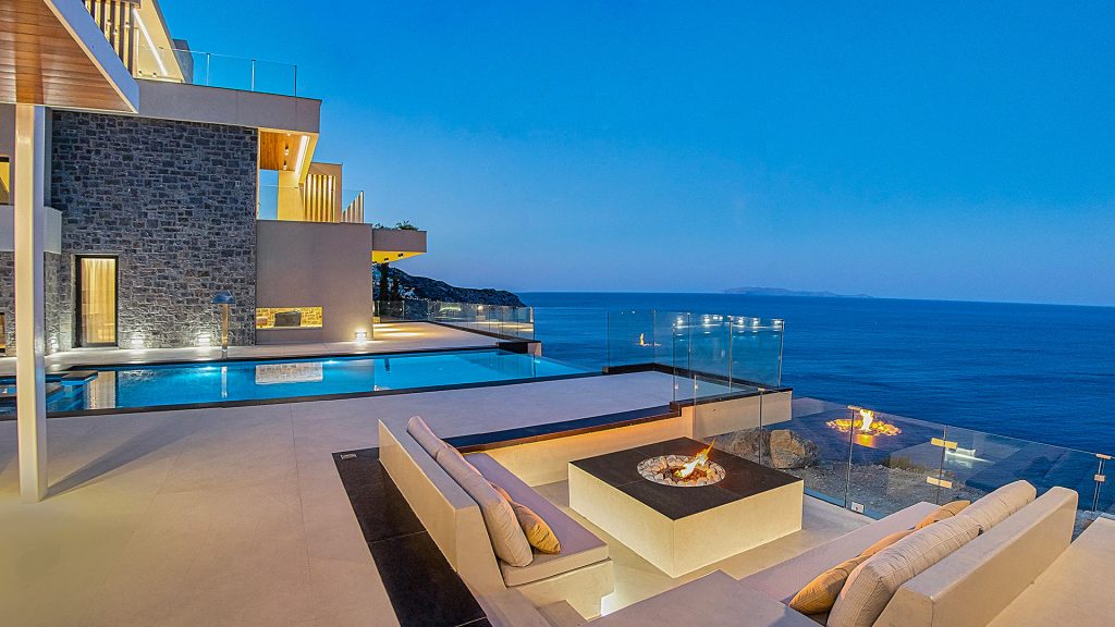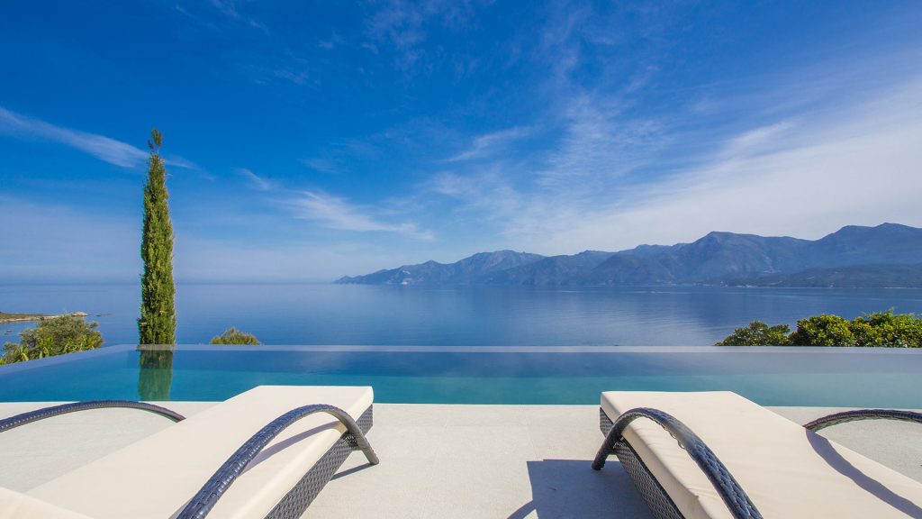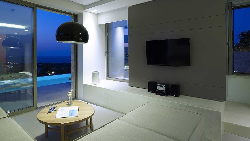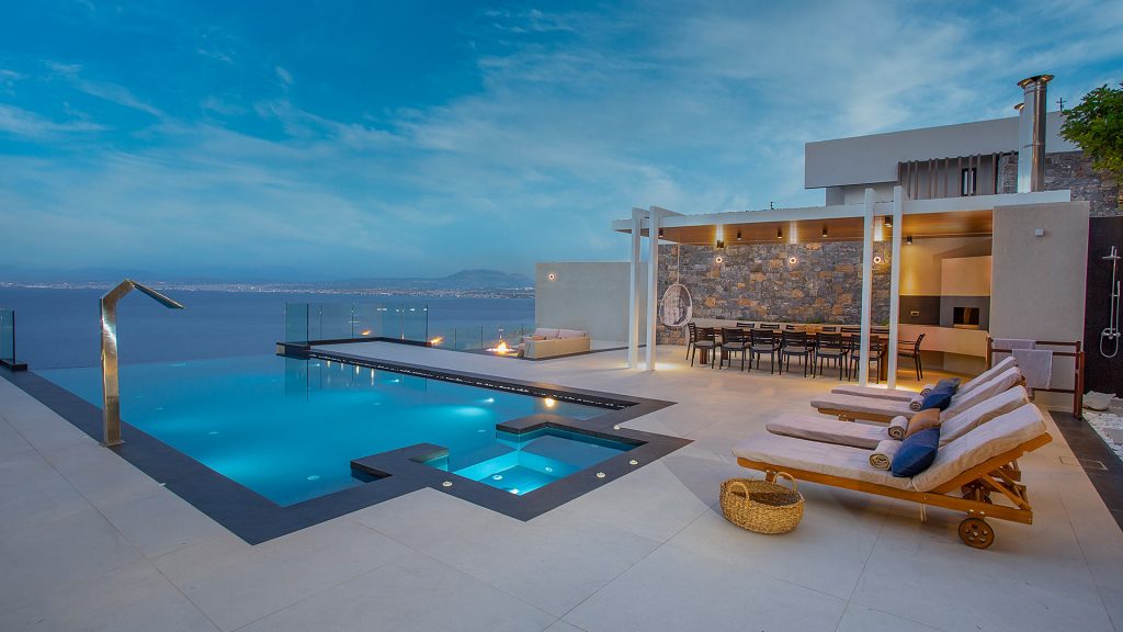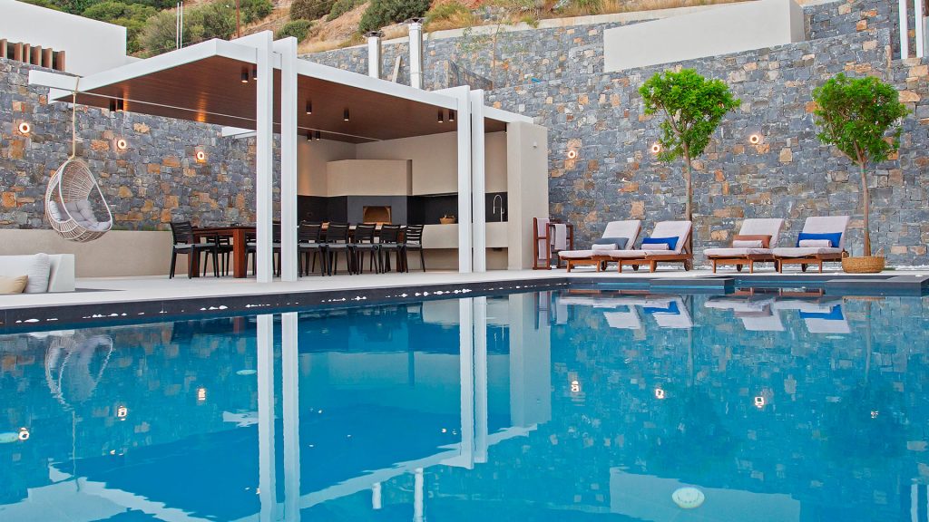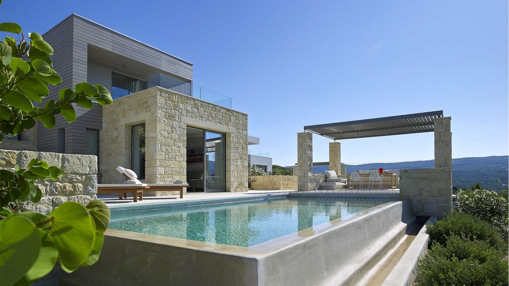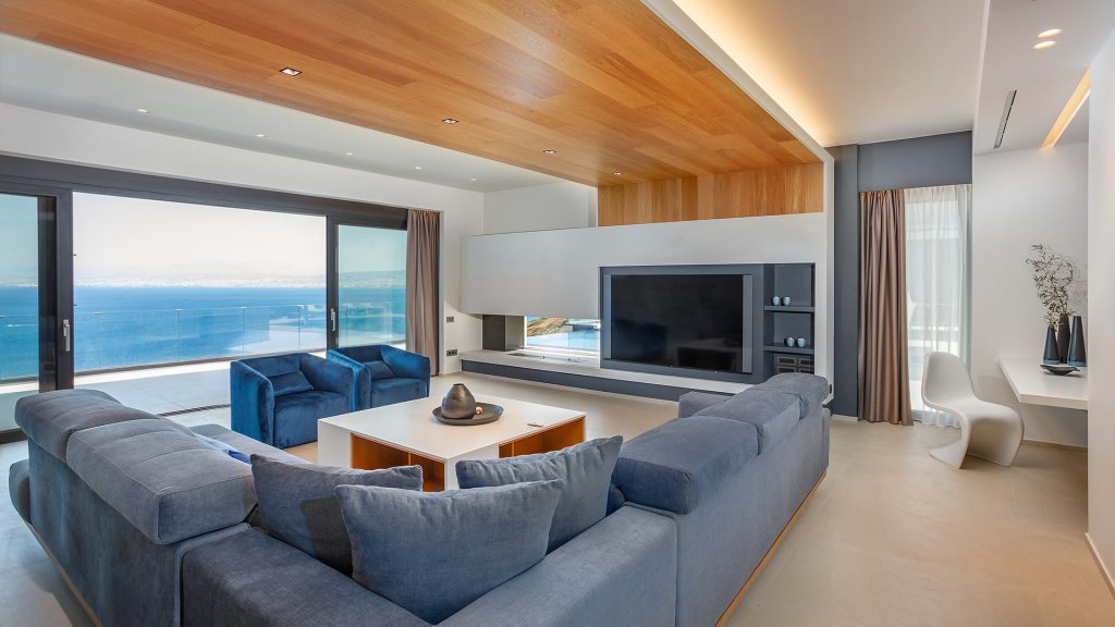 Вілла пропонує усамітнення та чудовий вид на затоку Калафатіс завдяки продуманому плануванню, яке особливо помітне на відкритій терасі затишної вітальні, де приватний пейзажний басейн оточує дерев'яна палуба із зручними шезлонгами.