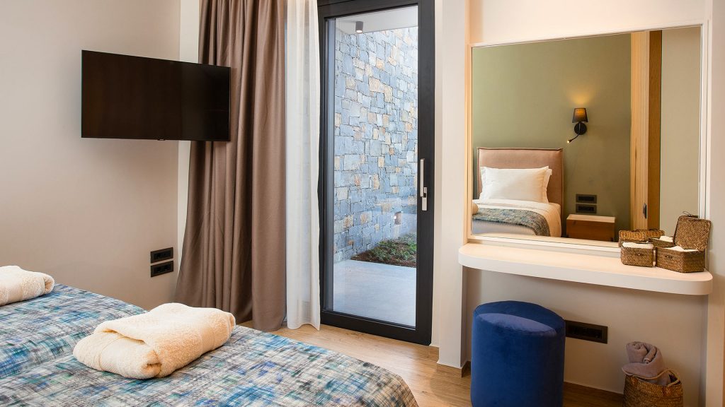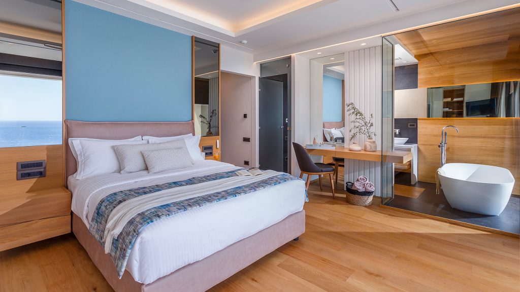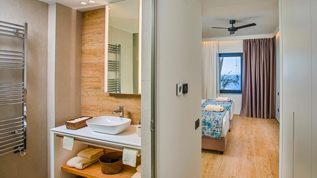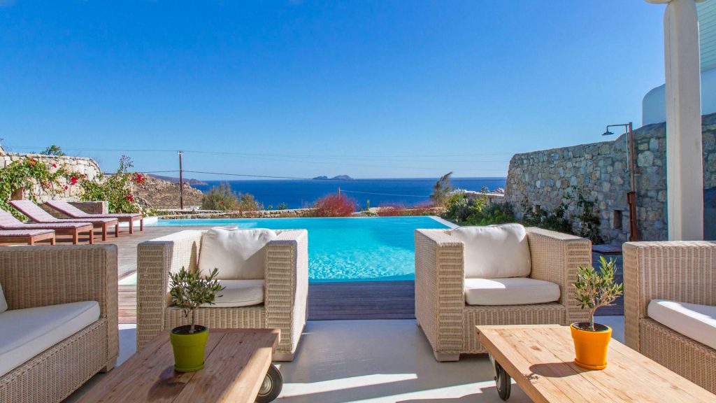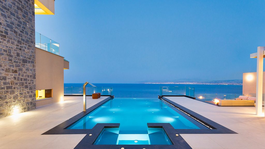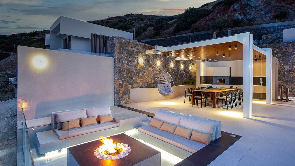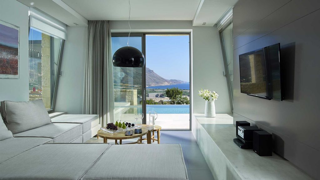 Вілла пропонує усамітнення та чудовий вид на затоку Калафатіс завдяки продуманому плануванню, яке особливо помітне на відкритій терасі затишної вітальні, де приватний пейзажний басейн оточує дерев'яна палуба із зручними шезлонгами.