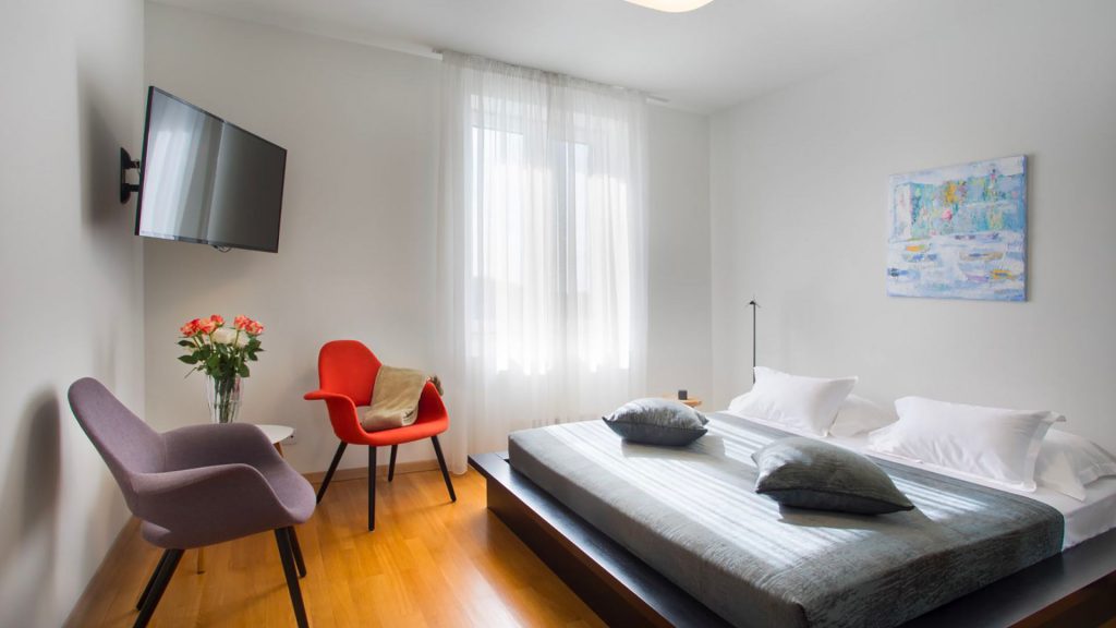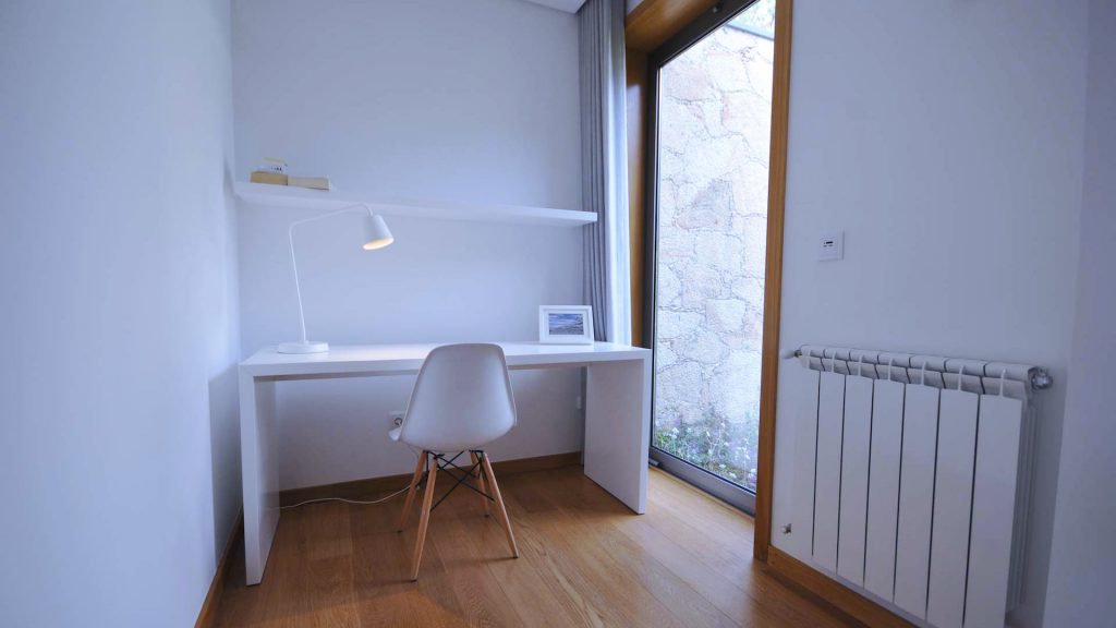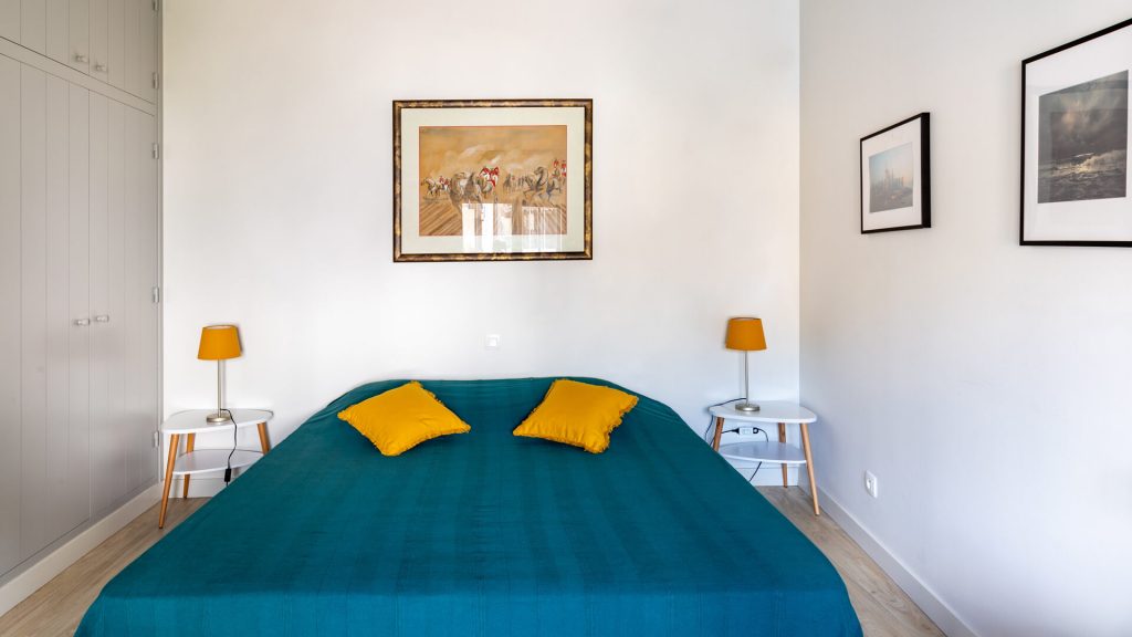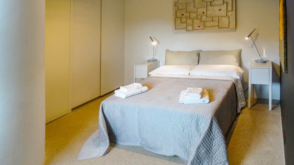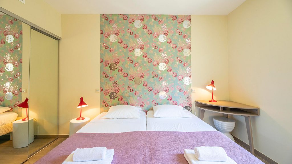 У спальнях є високе дзеркало, велика шафа, дерев'яна табуретка та невеликий вбудований стіл.