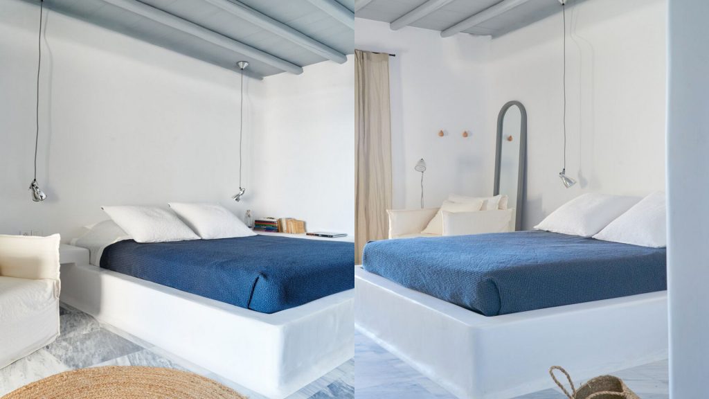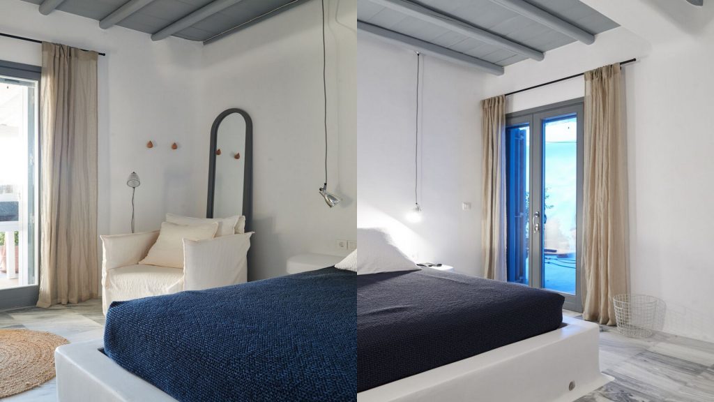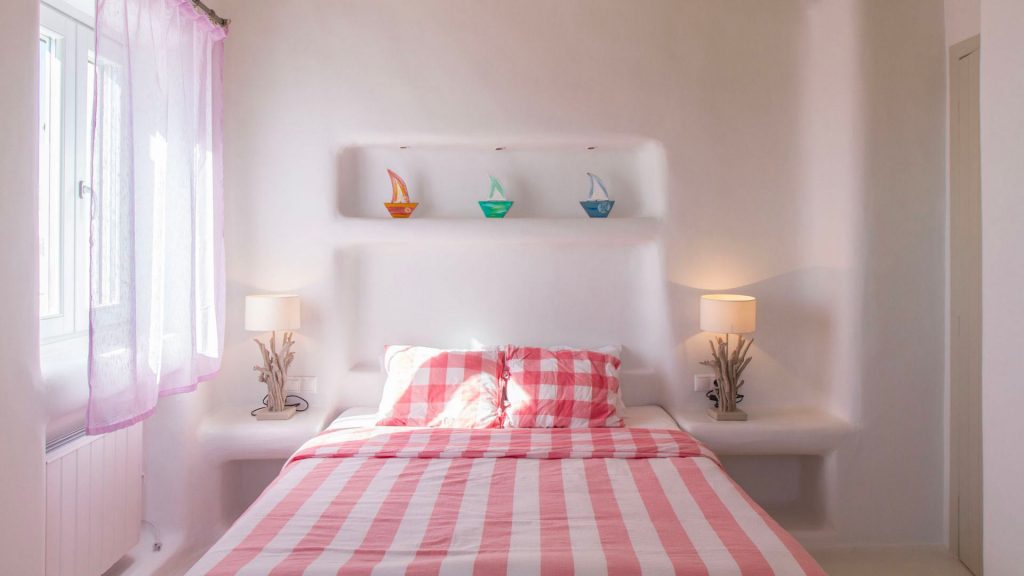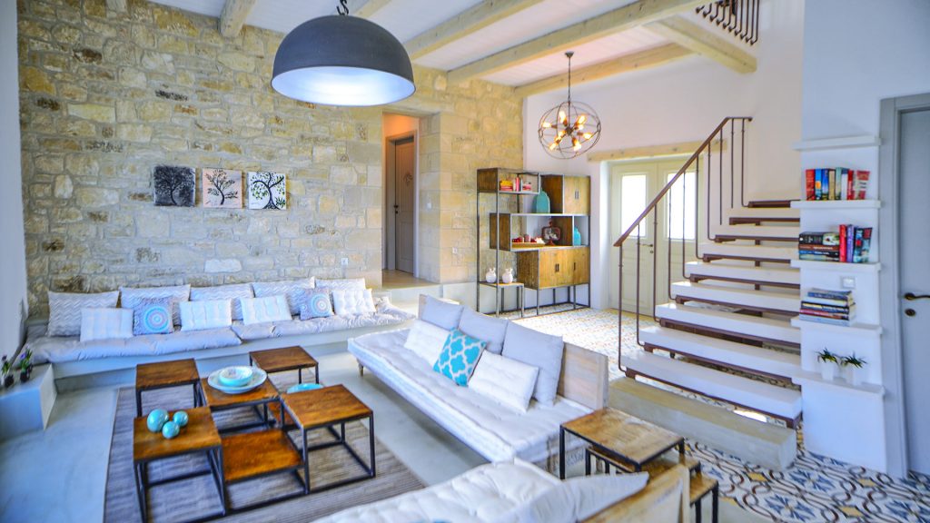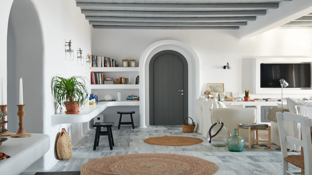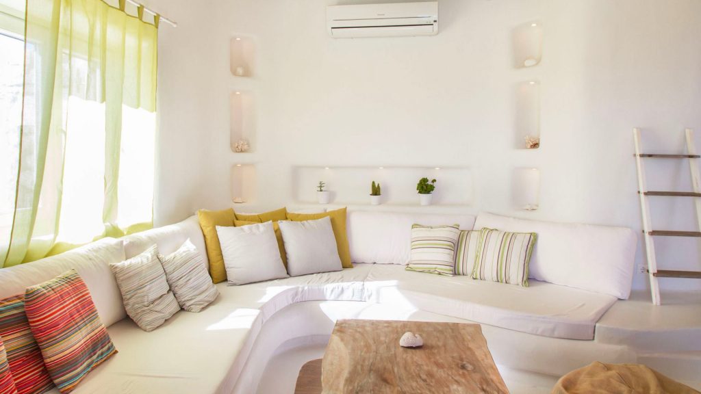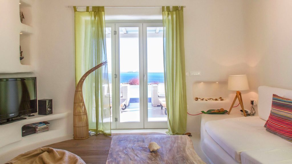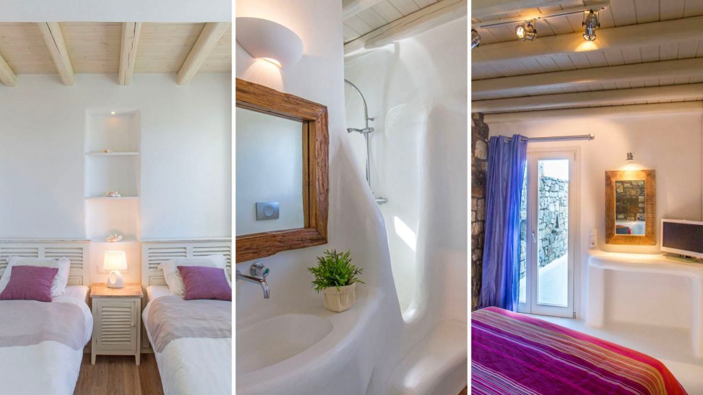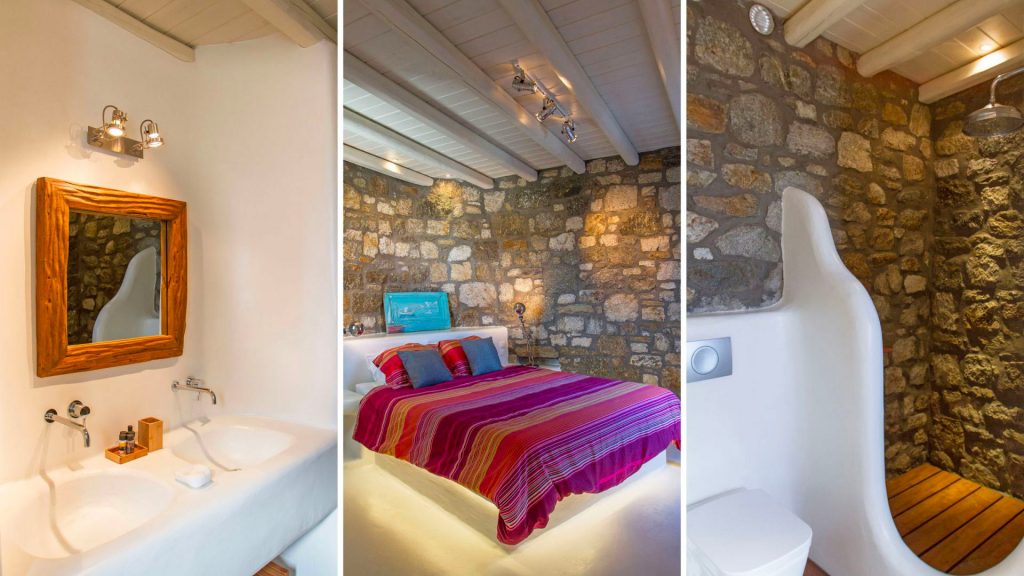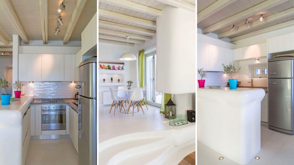Дизайн інтер'єру - це Міконос у всій красі: багато білого кольору, врівноваженого барвистим декором, а також використання місцевого каміння. Простір особливо добре розподілений, тому що в цьому будинку площею 130 квадратних метрів є 3 спальні та всі необхідні житлові приміщення без шкоди для комфорту, якості чи зручності.