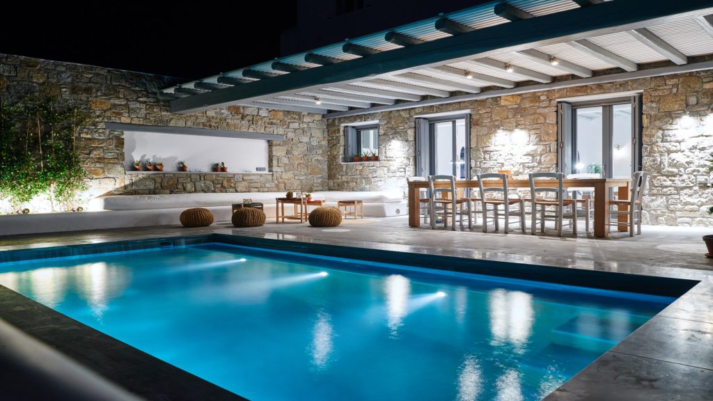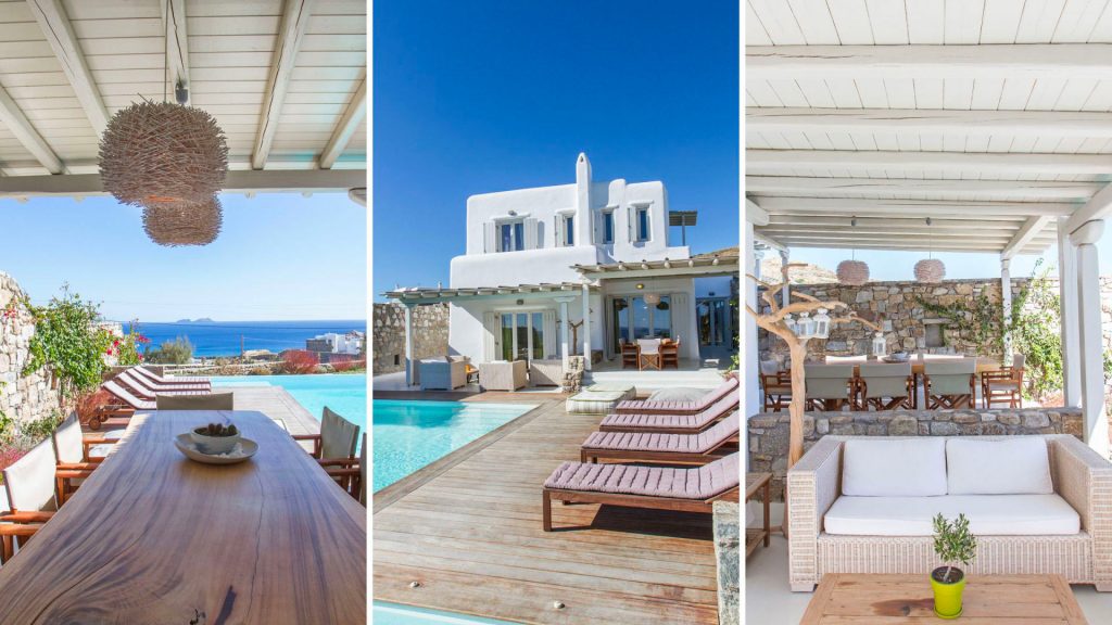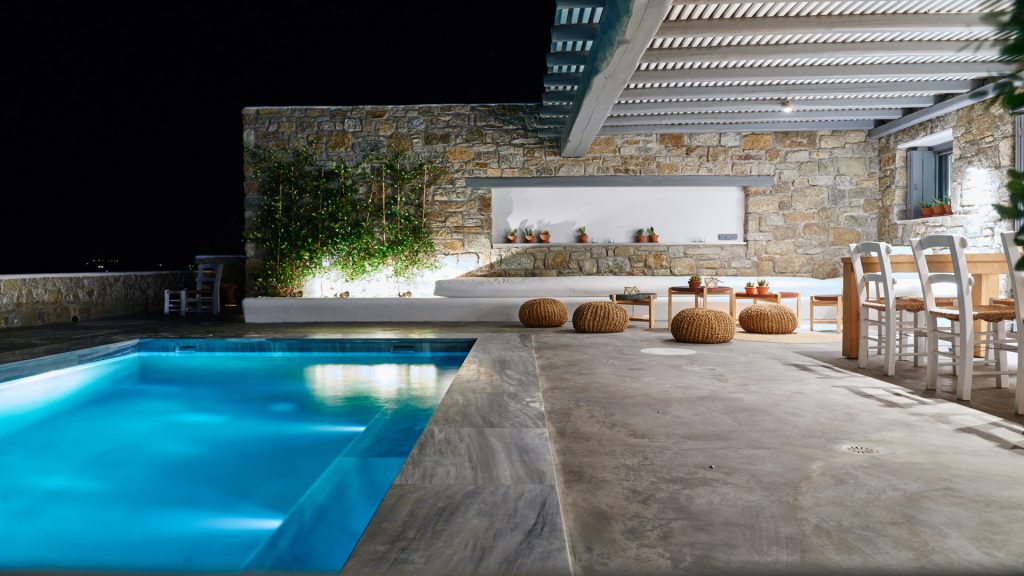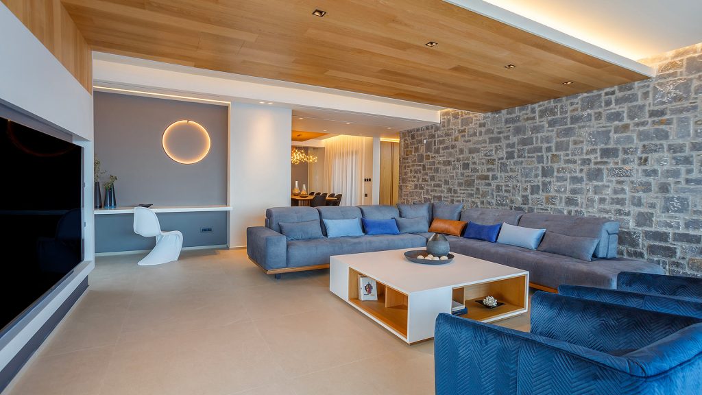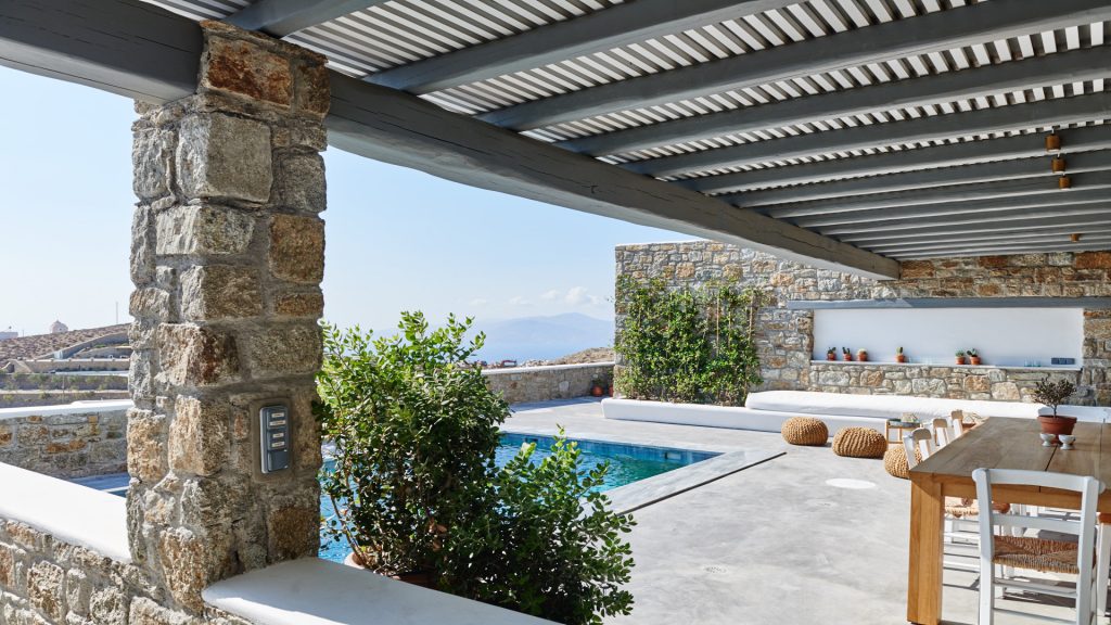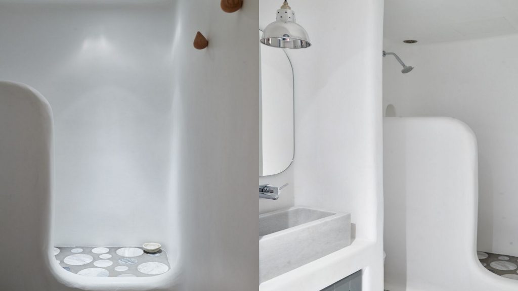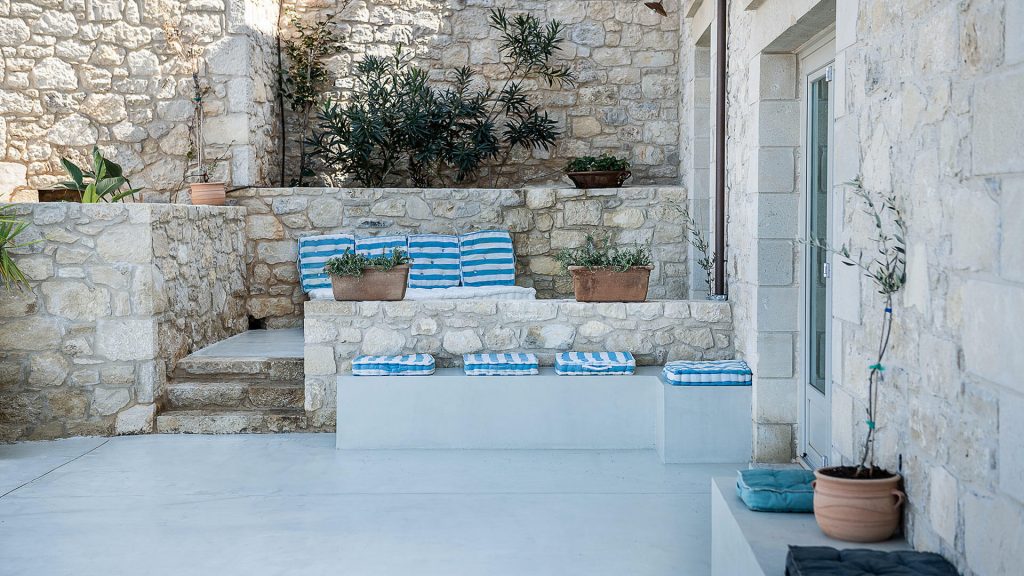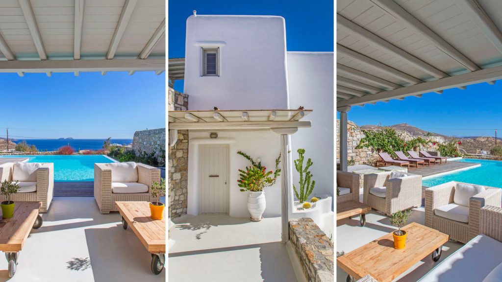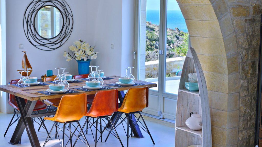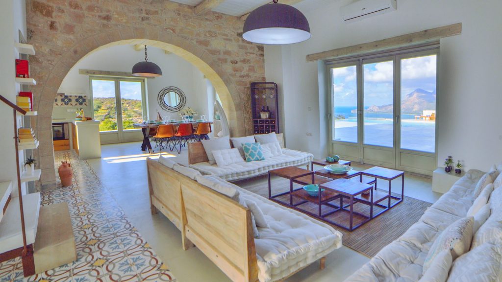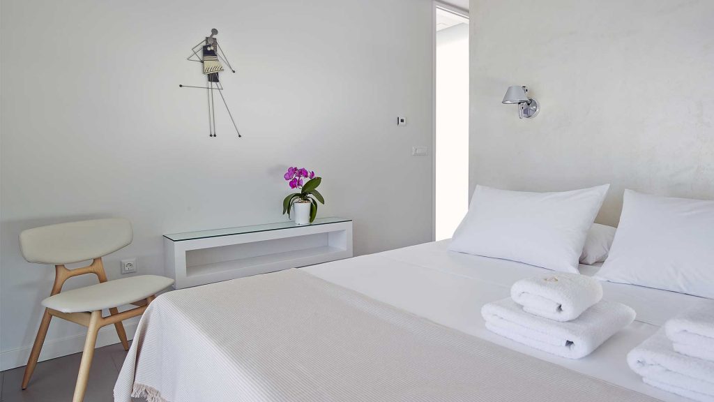 Дизайн інтер'єру - це Міконос у всій красі: багато білого кольору, врівноваженого барвистим декором, а також використання місцевого каміння. Простір особливо добре розподілений, тому що в цьому будинку площею 130 квадратних метрів є 3 спальні та всі необхідні житлові приміщення без шкоди для комфорту, якості чи зручності.