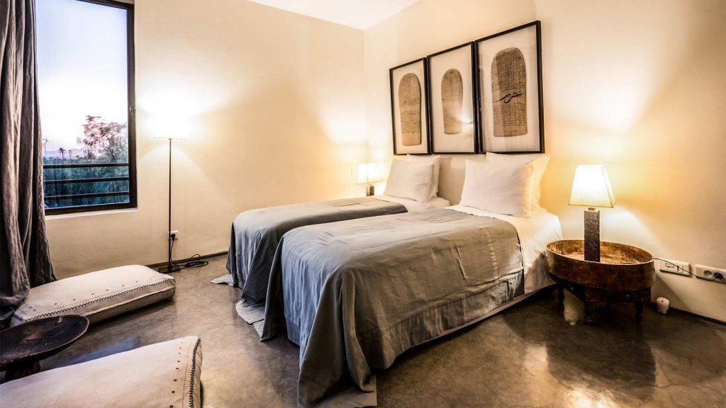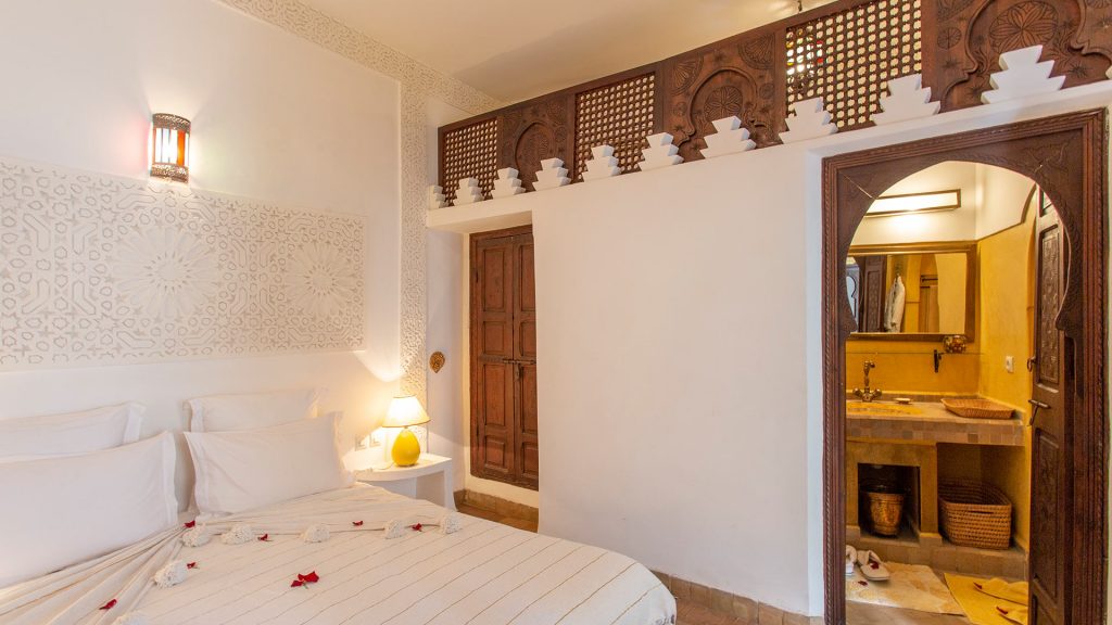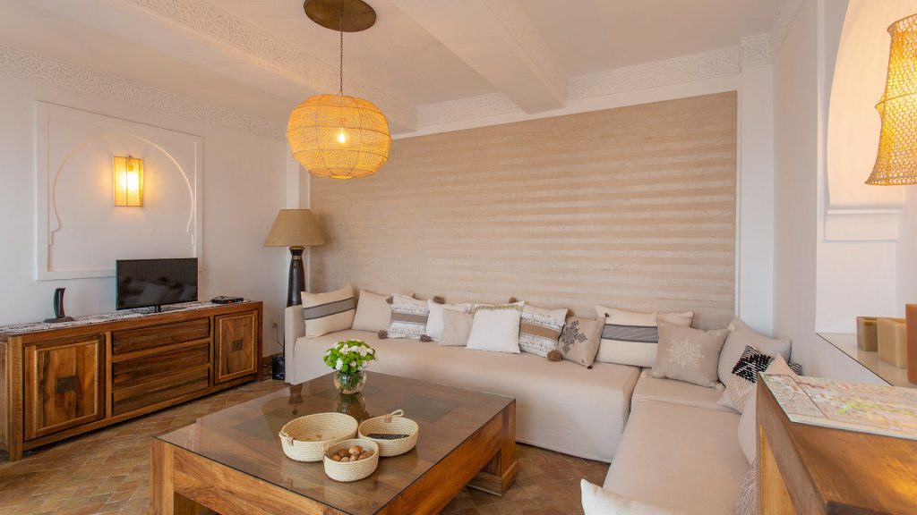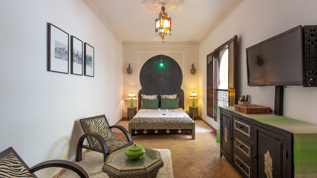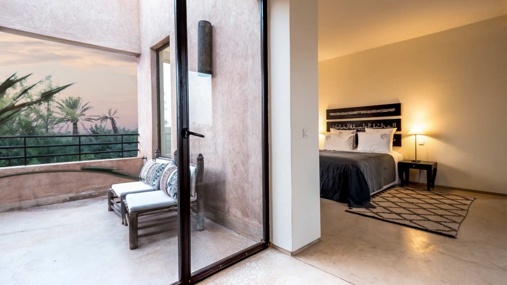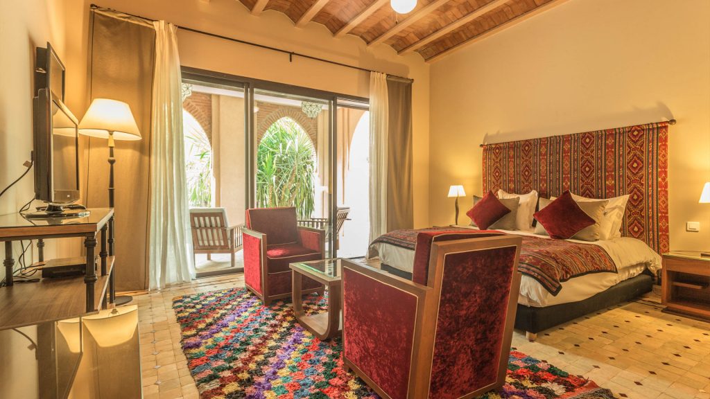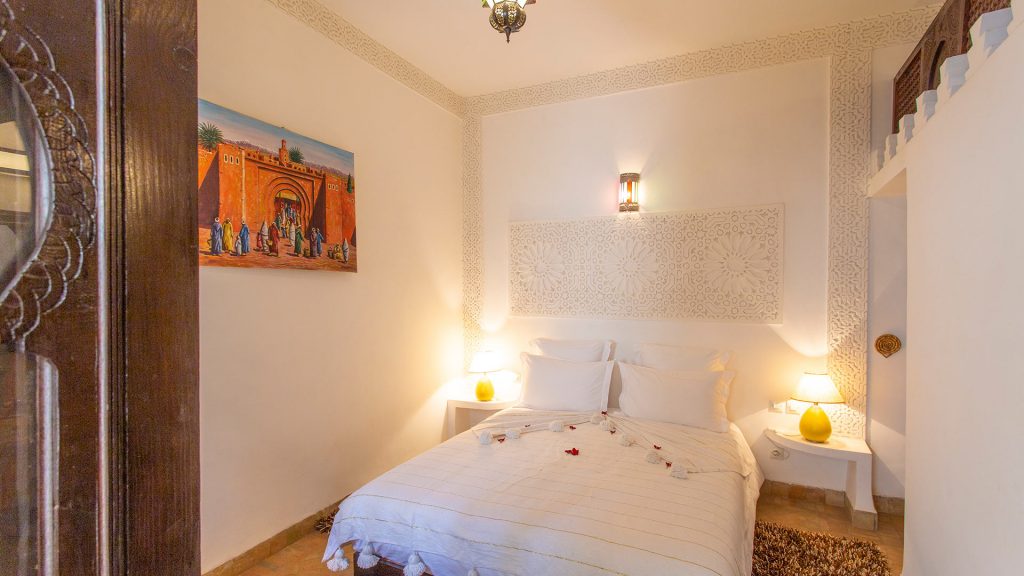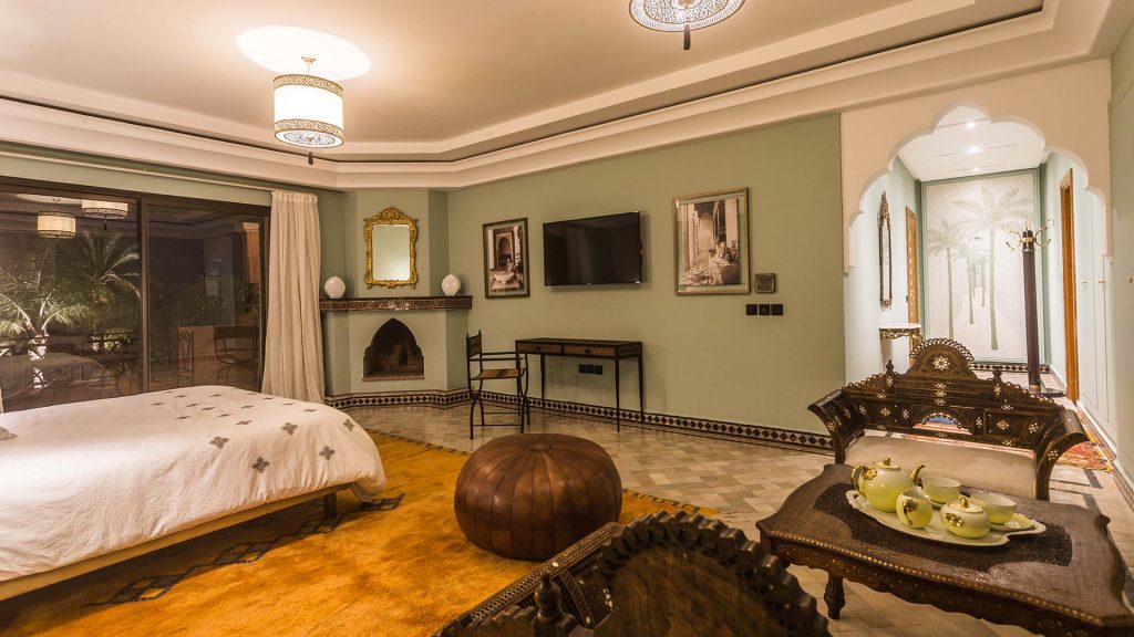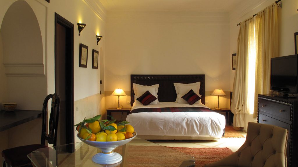 Усі номери світлі та сонячні, обставлені сучасними предметами та предметами етнічного мистецтва. Французькі вікна виходять на терасу, і вид на Атласький хребет просто приголомшливий, особливо в зимовий час. Є велика вітальня, їдальня та телевізор або сімейна кімната. Є камін та зручні дивани, гарний хаммам та масажний кабінет. Процедури доступні на запит.